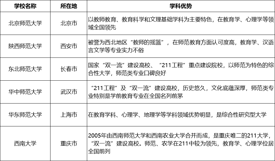 北京师范大学(北京)、华东师范大学(上海)、华中师范大学(武汉)、东北师范大学(长春)、陕西师范大学(西安)、西南大学(重庆),各校的学科优势如下:
