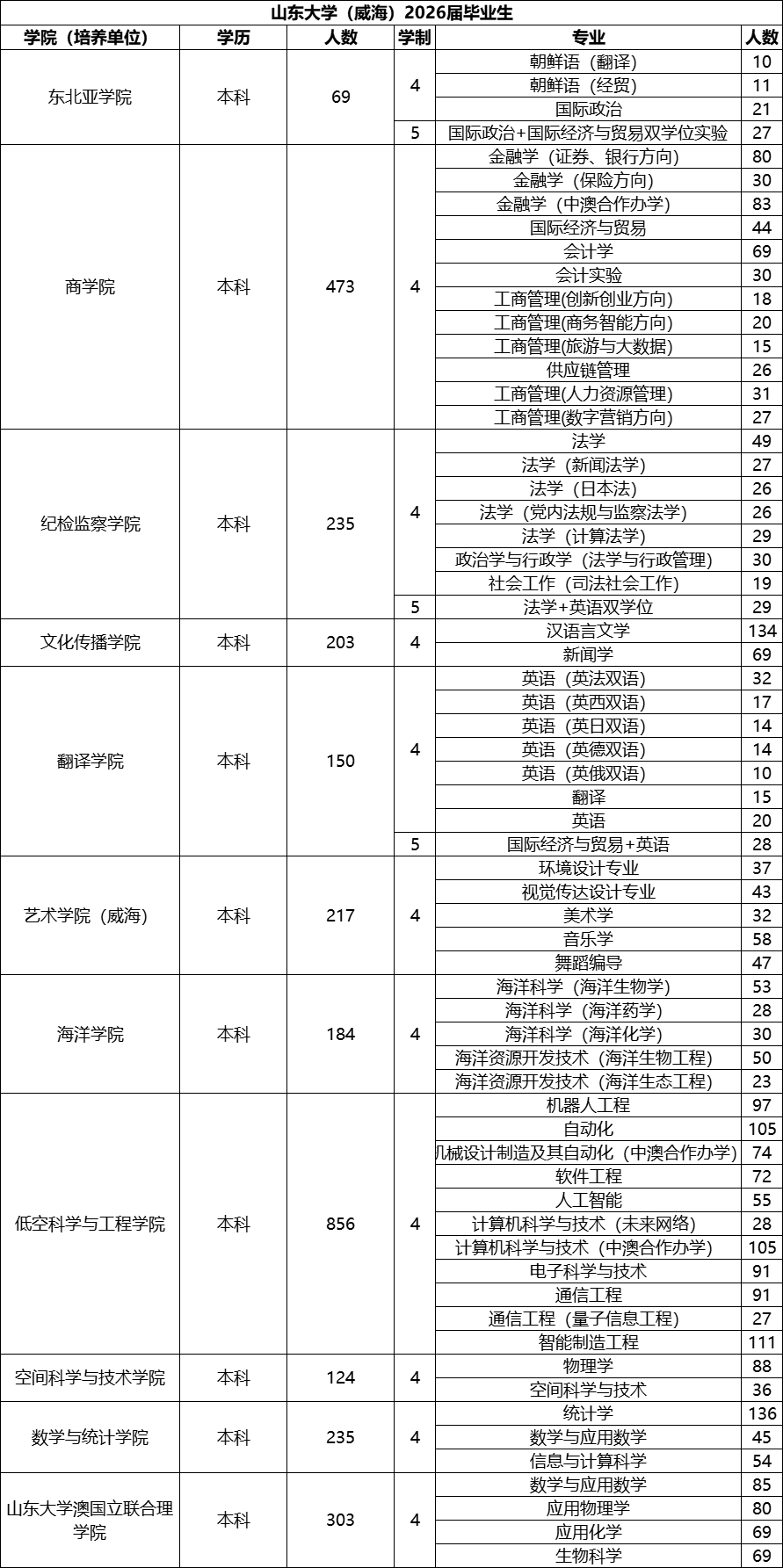 下方表格展示的是山东大学(威海)的各个二级学院的毕业生人数、及本科各专业的毕业生人数汇总!
