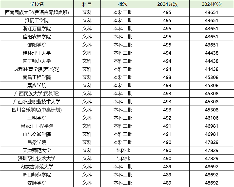 2024年有22所大学在490分左右进行招生录取,有20所在本科二批进行录取。高考成绩在490分左右能够选择的大学院校有西南民族大学(彝语言零起点班)、淮阴工学院、浙江万里学院、信阳农林学院、邵阳学院、桂林理工大学、南宁师范大学、成都体育学院(艺术类)、南昌工程学院等。很适合高考位次排名在48000名以内的考生选择。