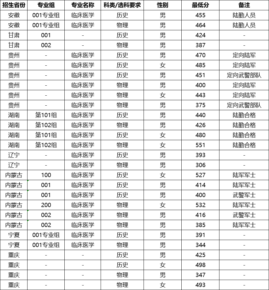 历史类(100专业组,临床医学,陆军军士,女生):最低分527分,最高分527分,录取1人