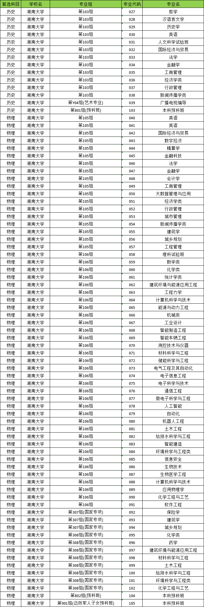 下表汇总了湖南大学2026年针对湖南省考生的主要专业代码及对应专业名称,供大家参考: