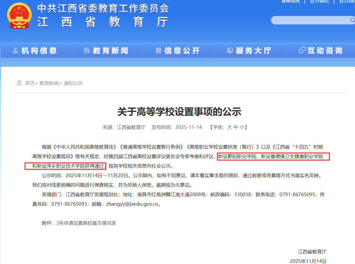 江西省教育厅于2025年11月14日发布《关于高等学校设置事项的公示》,正式宣布三所新建公办高等院校获得通过。