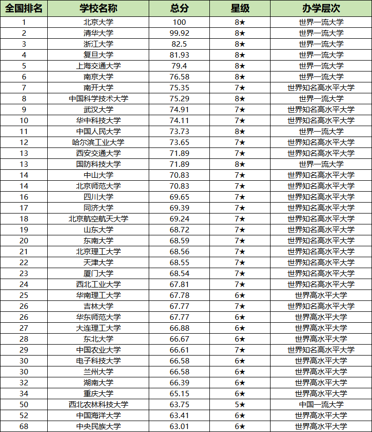 北京大学(全国第1名)和清华大学(全国第2名)继续稳居榜单前两位,双双获评8★世界一流大学。两校在基础学科、科研创新、师资力量及国际影响力等方面长期处于国内领先地位,是综合实力最强、录取门槛最高的高校。