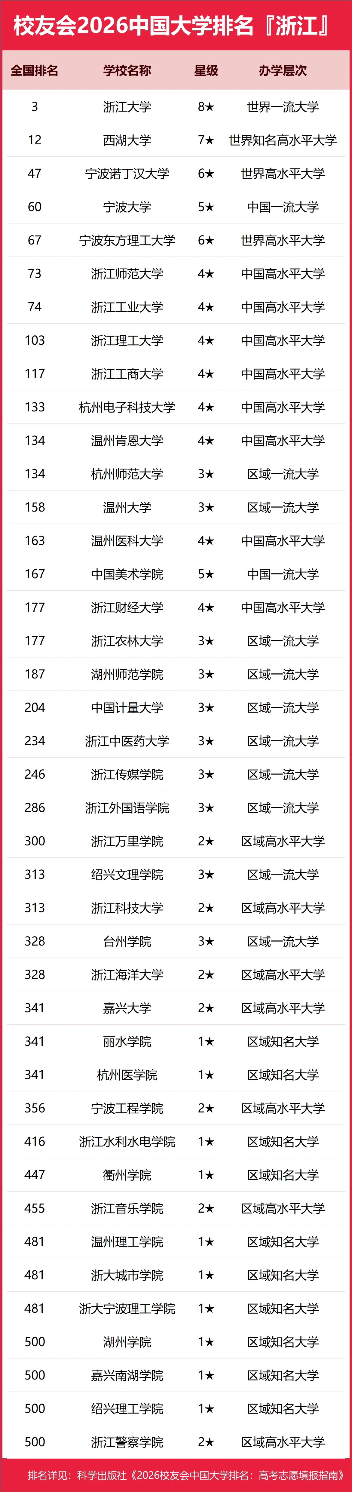 以下是2026年校友会浙江省大学排名一览表: