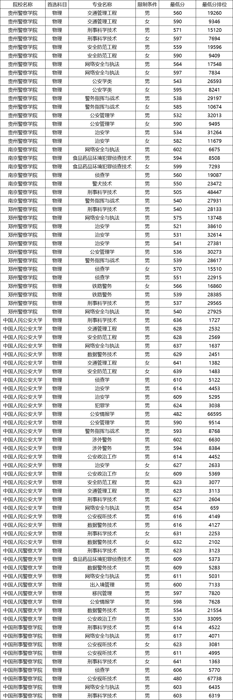2025年贵州物理类警校招生规模较大,涵盖技术类与执法类多类专业,男女生录取分数差异明显,整体分数区间从480分至654分,对应排位从约6.7万位至659位。