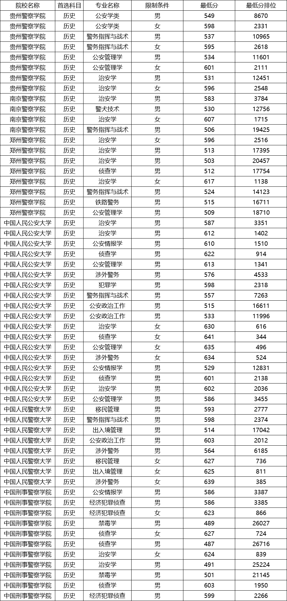 中国刑事警察学院部分专业如“禁毒学”“侦查学”男生最低分在487分左右,为分数较低的历史类考生提供了报考机会。