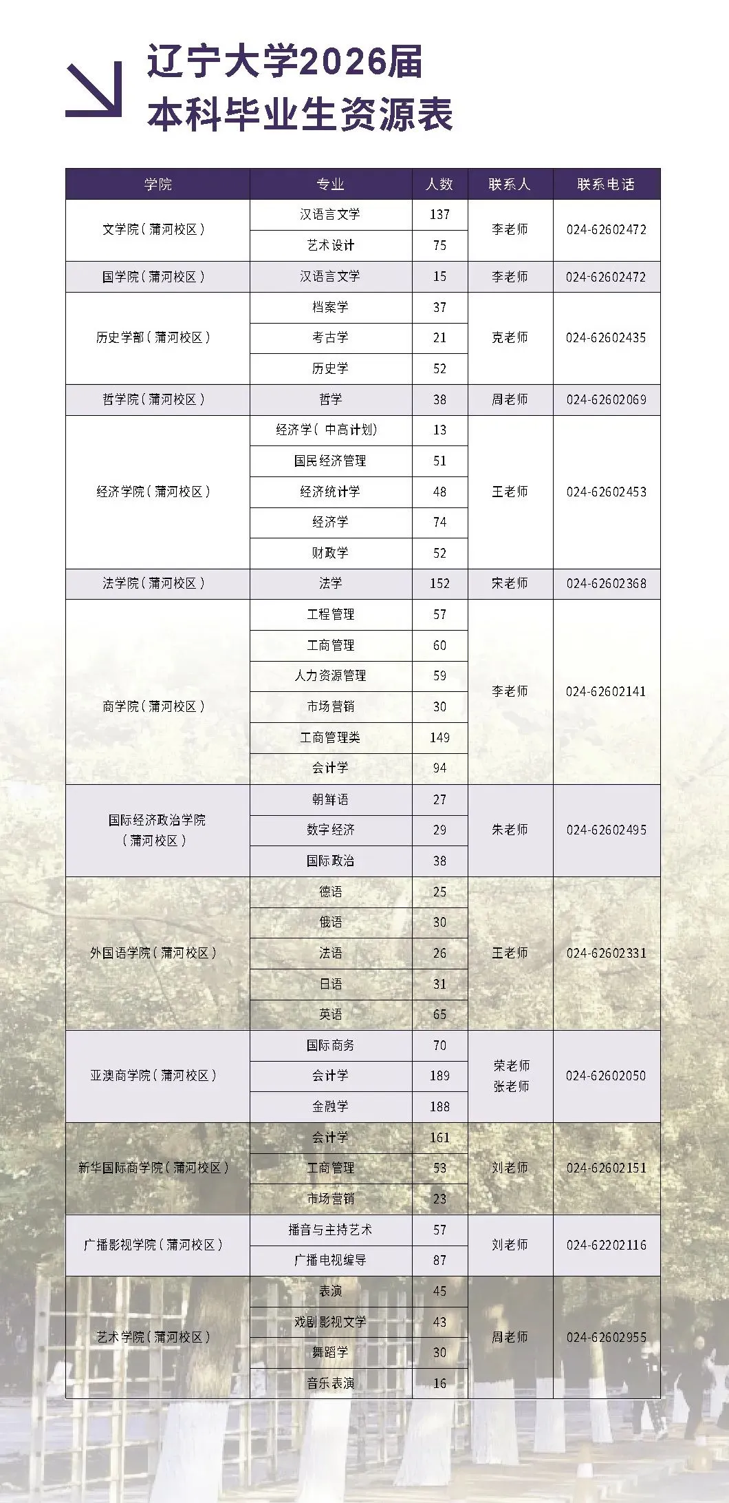 下方表格展示的是辽宁大学的各个二级学院的毕业生人数、及本科各专业的毕业生人数汇总!