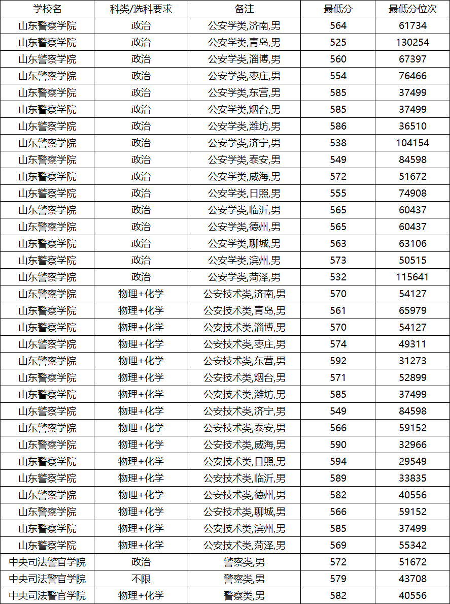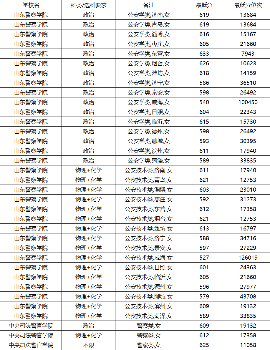 以下为中央司法警官学院、山东警察学院、中国刑事警察学院2025年在山东本科提前批公安类专业录取最低分及位次,按性别分类整理。