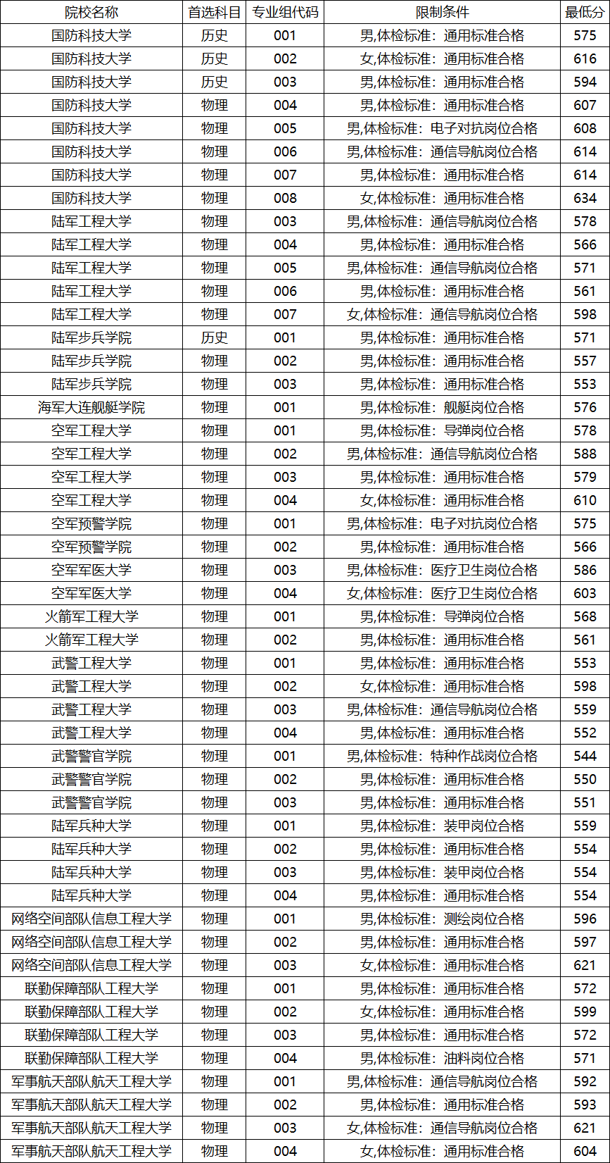 2025年甘肃历史类考生想要就读军校,录取最低分普遍在571分以上。其中,录取最低的院校是陆军步兵学院(001专业组),最低录取分为571分;国防科技大学(001专业组),最低录取分为571分。