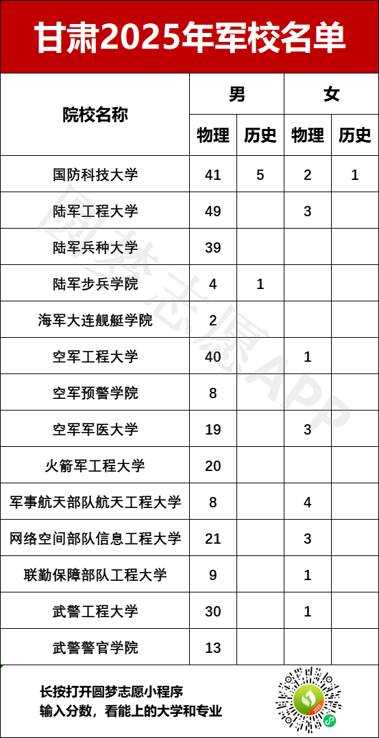 以下是甘肃2025年军校名单及招生计划汇总: