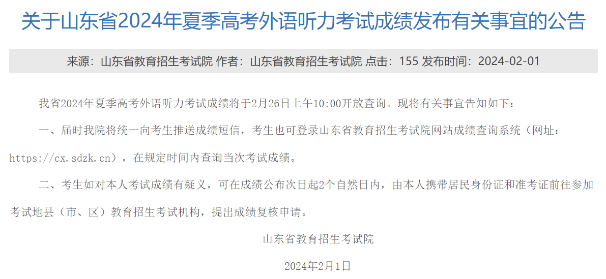 山东省教育招生考试院宣布2024年夏季高考外语听力考试成绩将于2月26日上午10:00公布。考生可通过短信推送或网上查询系统获取成绩。