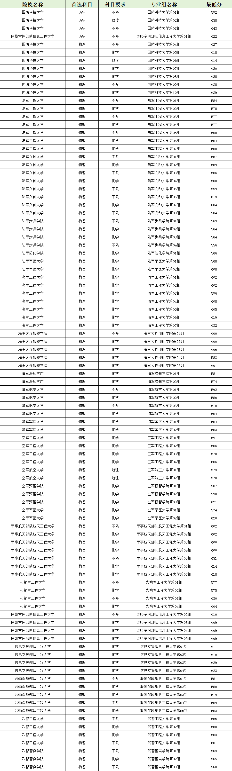 | 陆军步兵学院 | 物理 | 男 | 582 |
