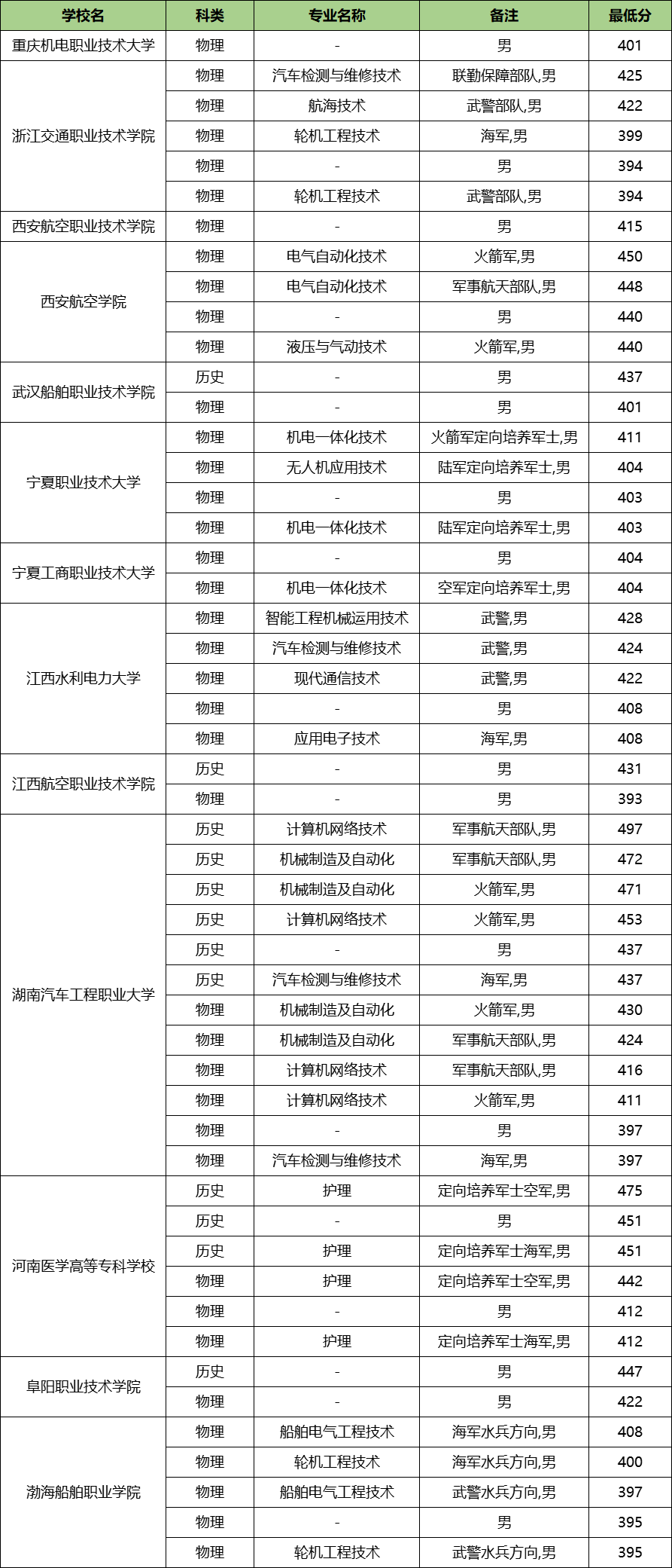 由于河南省教育考试院目前暂未公布2026年定向士官的录取分数线,我们可以参考2025年已公布的学校数据。以2025年为例,根据部分学校已公布的录取数据来看,定向士官院校在河南的录取分数线在393-497分之间,录取分数线最高的是湖南汽车工程职业大学的计算机网络技术专业,要求为历史类男生;录取分数线最低的是江西航空职业技术学院的男生。
