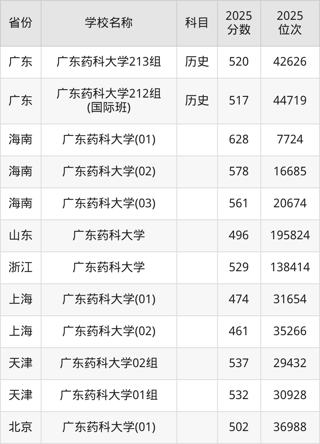 二、广东药科大学各专业录取分数线