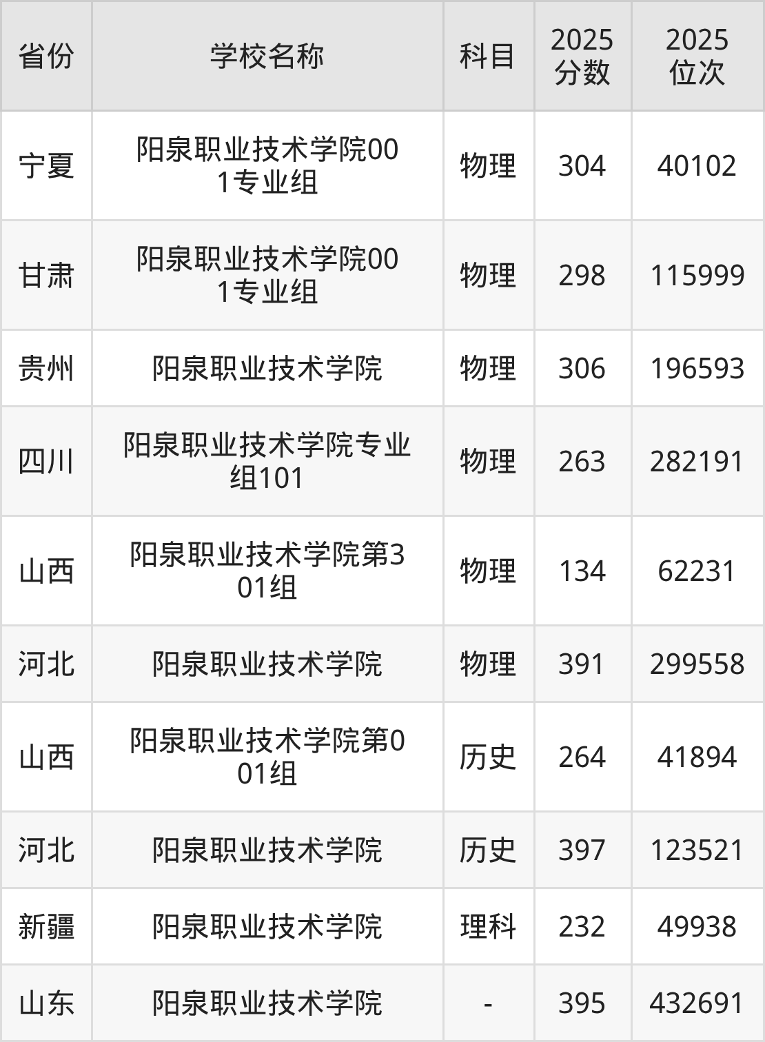 一、2025阳泉职业技术学院录取分数线