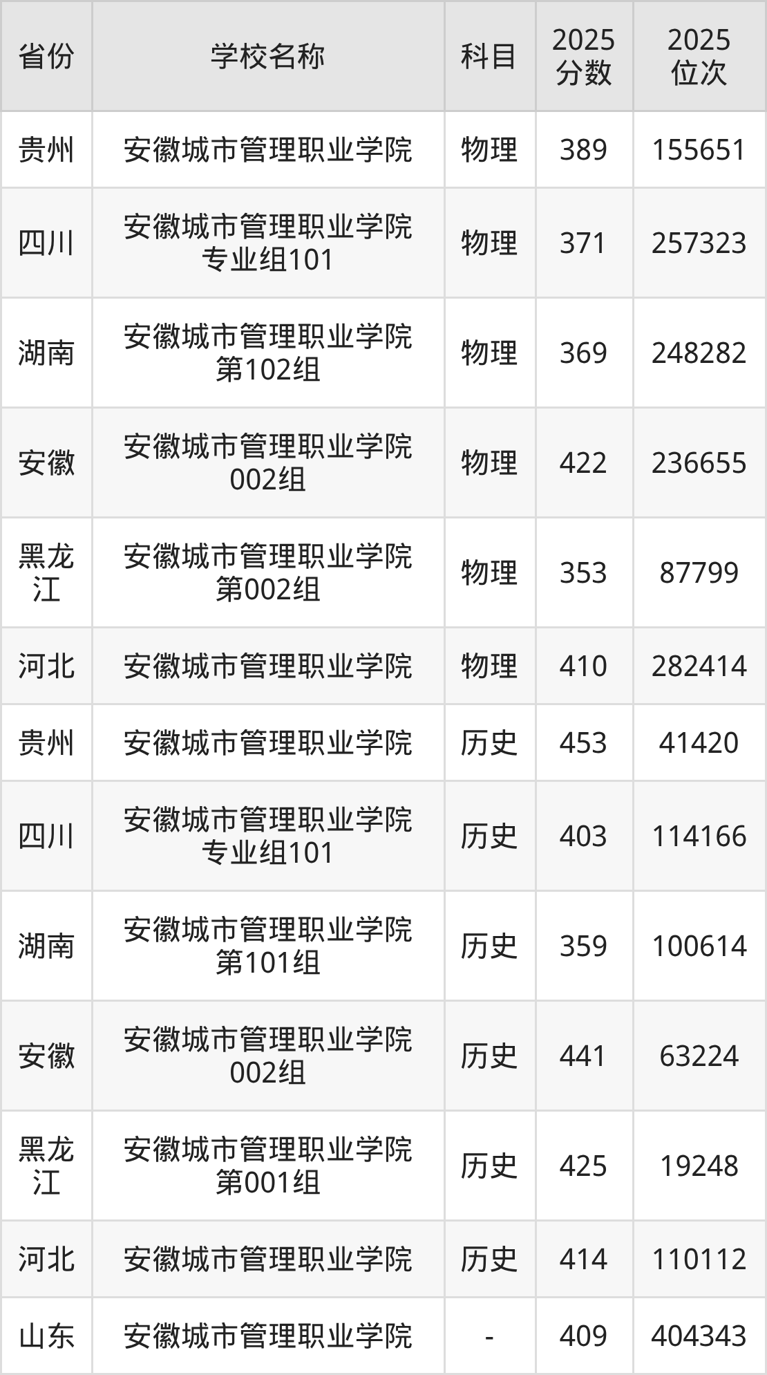 再看安徽高考2025年专科批次线,历史类是200分、物理类是200分。通过对比发现:安徽城市管理职业学院2025年历史类最低分比专科线高241分,物理类最低分比专科线高222分。2026届安徽高考生,可通过每一次模考划线,来判断自己的成绩是否有机会被安徽城市管理职业学院录取。