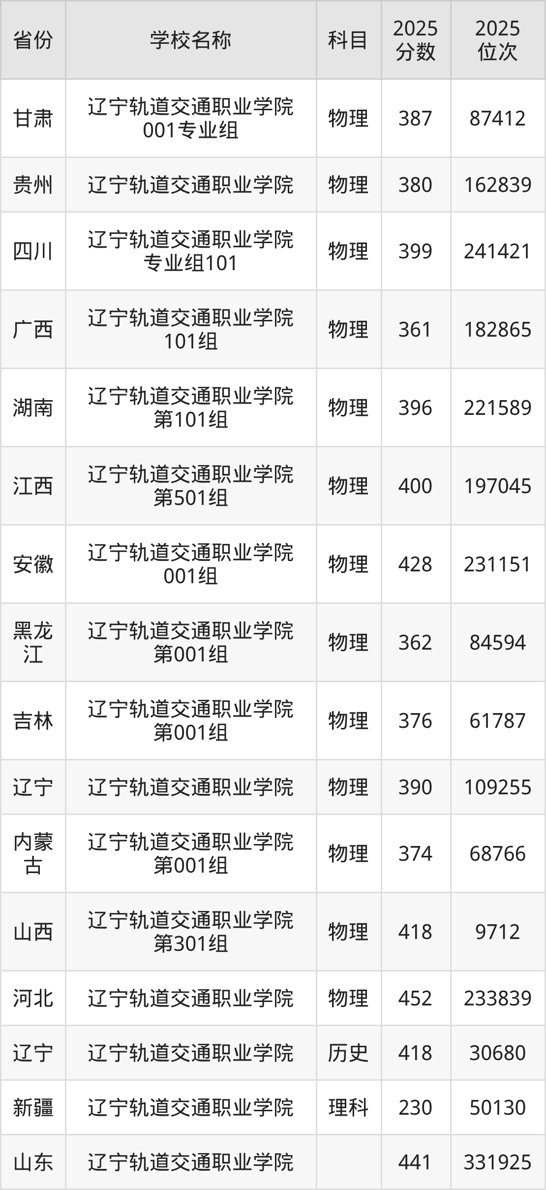 2025年辽宁轨道交通职业学院在全国各省专科的最低录取分数线在230~452分之间。河北物理类高考生最低452分能上辽宁轨道交通职业学院、山东高考生最低441分能上辽宁轨道交通职业学院……下文将展示辽宁轨道交通职业学院在全国15个高考省份中的专科最低投档录取分汇总!