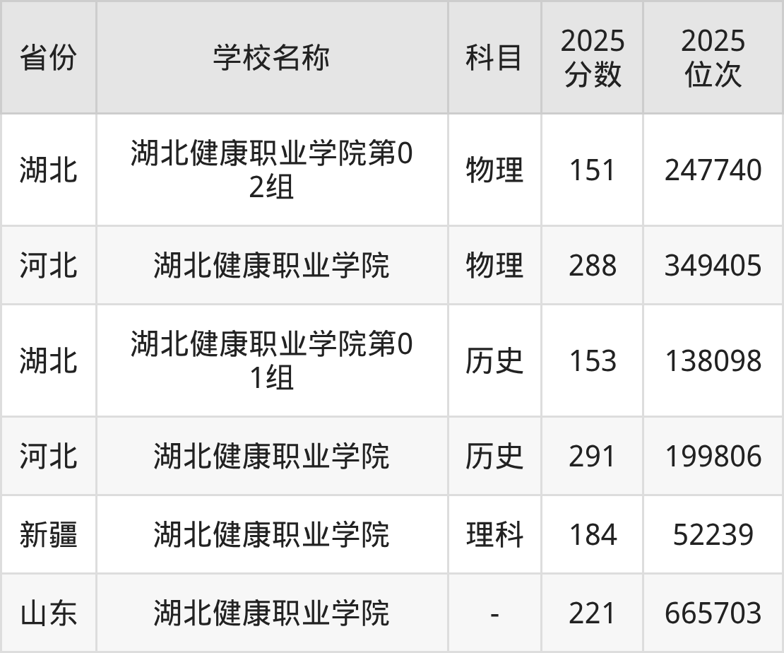 2025年湖北健康职业学院在全国各省专科的最低录取分数线在151~291分之间。河北物理类高考生最低288分能上湖北健康职业学院、山东高考生最低221分能上湖北健康职业学院……下文将展示湖北健康职业学院在全国4个高考省份中的专科最低投档录取分汇总!