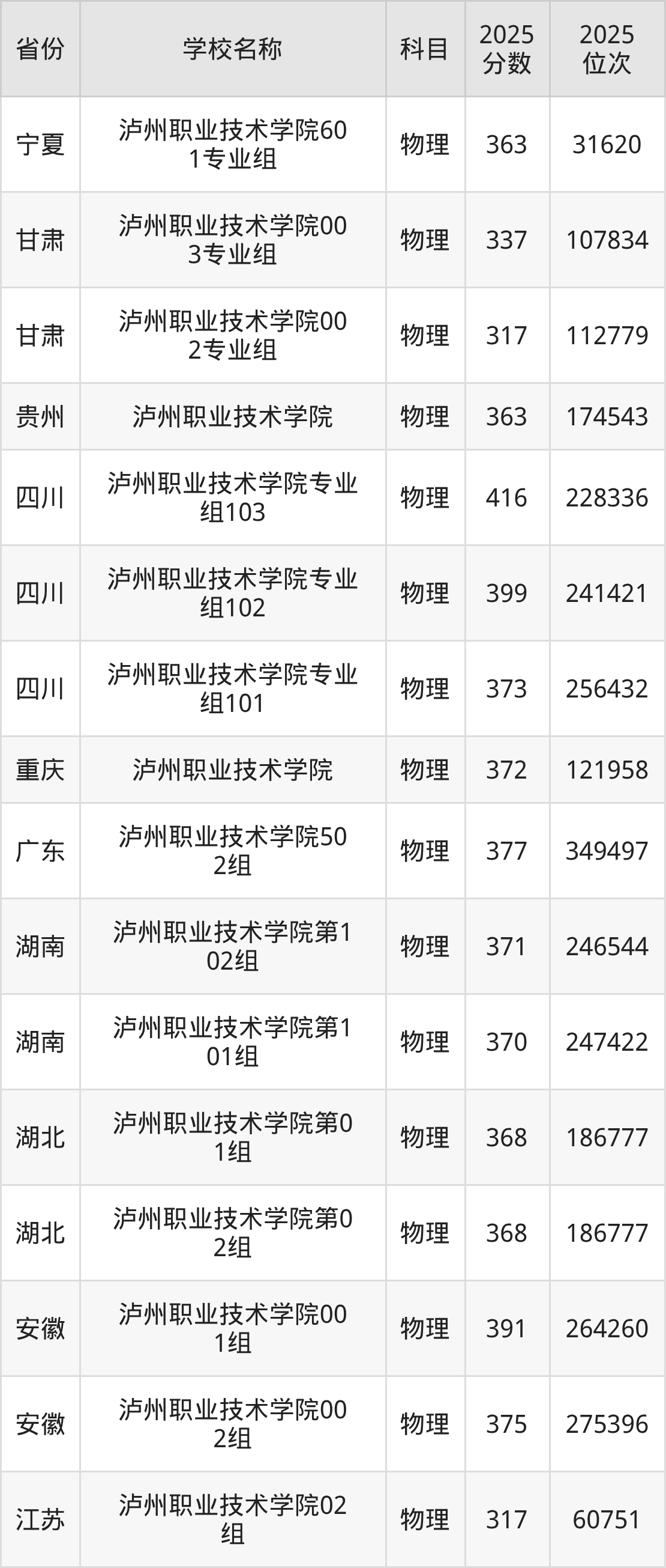 二、泸州职业技术学院各专业录取分数线