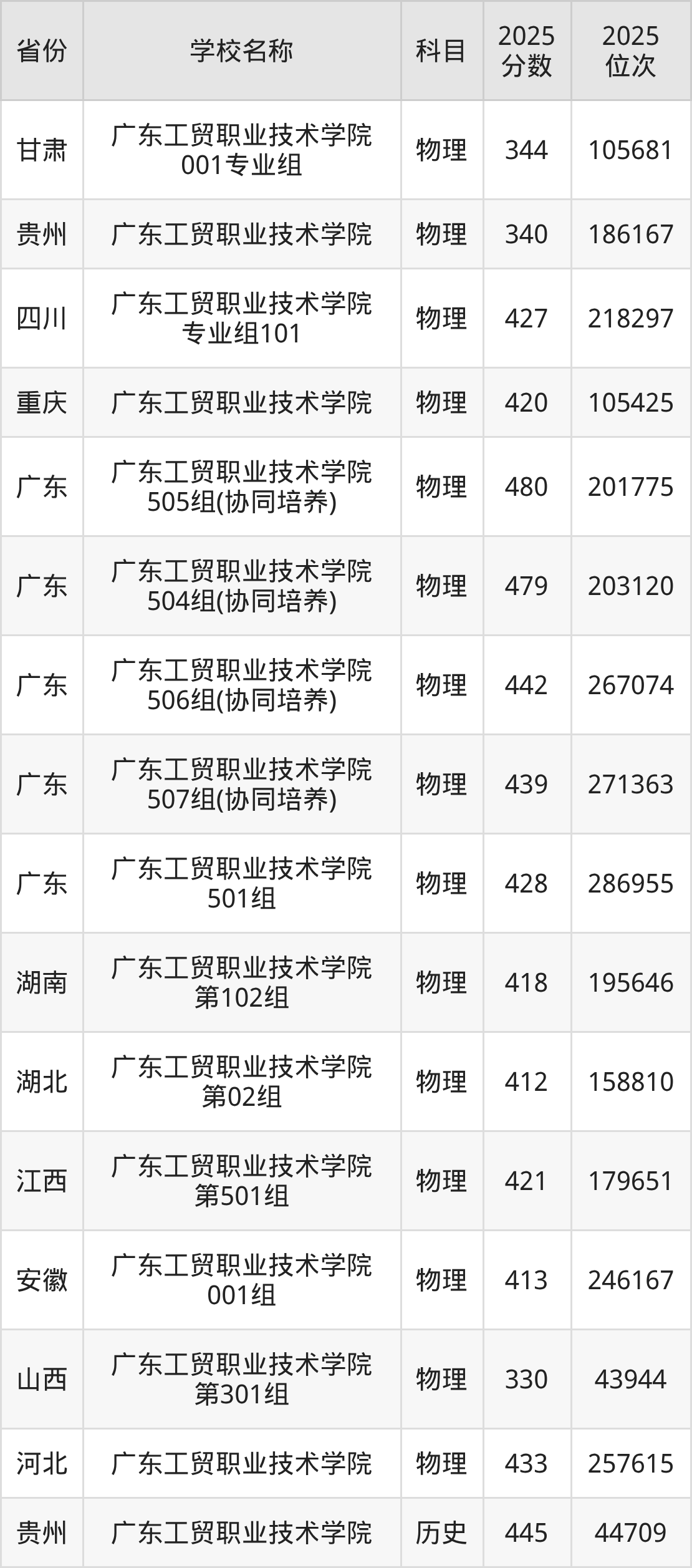 2025年广东工贸职业技术学院在全国各省专科的最低录取分数线在216~506分之间。广东物理类高考生最低480分能上广东工贸职业技术学院、河北物理类高考生最低433分能上广东工贸职业技术学院……下文将展示广东工贸职业技术学院在全国12个高考省份中的专科最低投档录取分汇总!