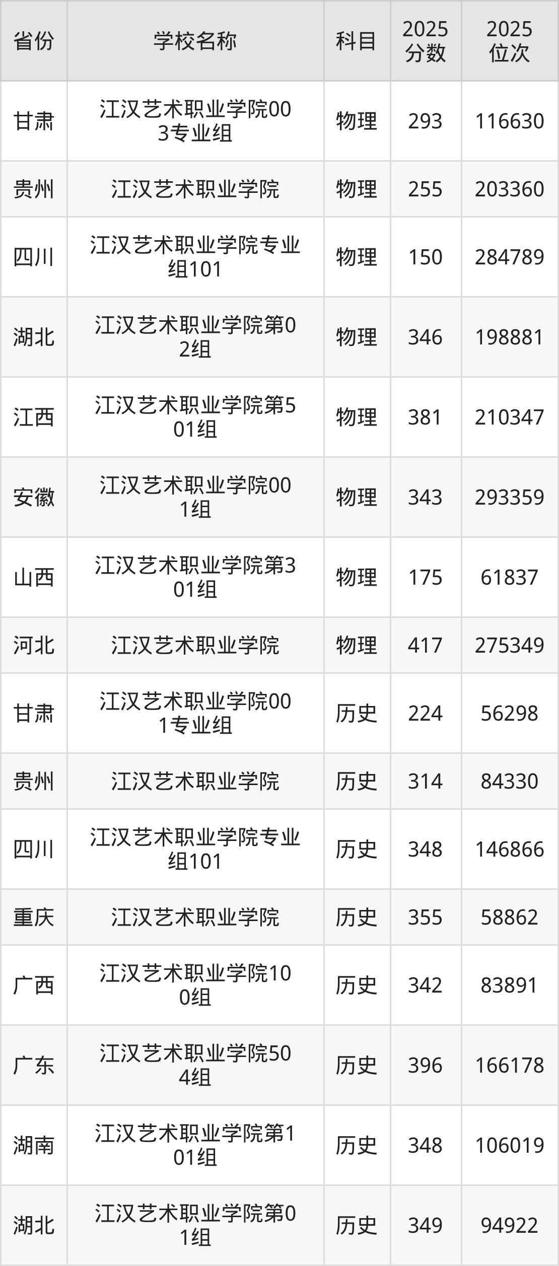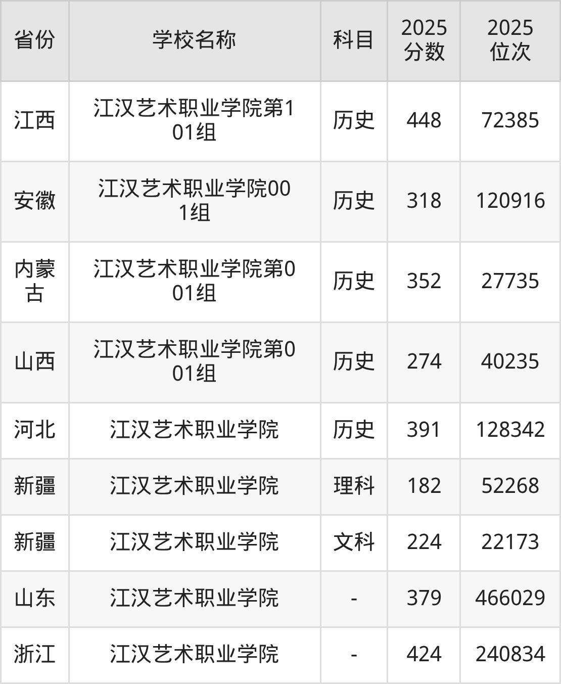 2025年江汉艺术职业学院在全国各省专科的最低录取分数线在150~448分之间。浙江高考生最低424分能上江汉艺术职业学院、河北物理类高考生最低417分能上江汉艺术职业学院……下文将展示江汉艺术职业学院在全国16个高考省份中的专科最低投档录取分汇总!