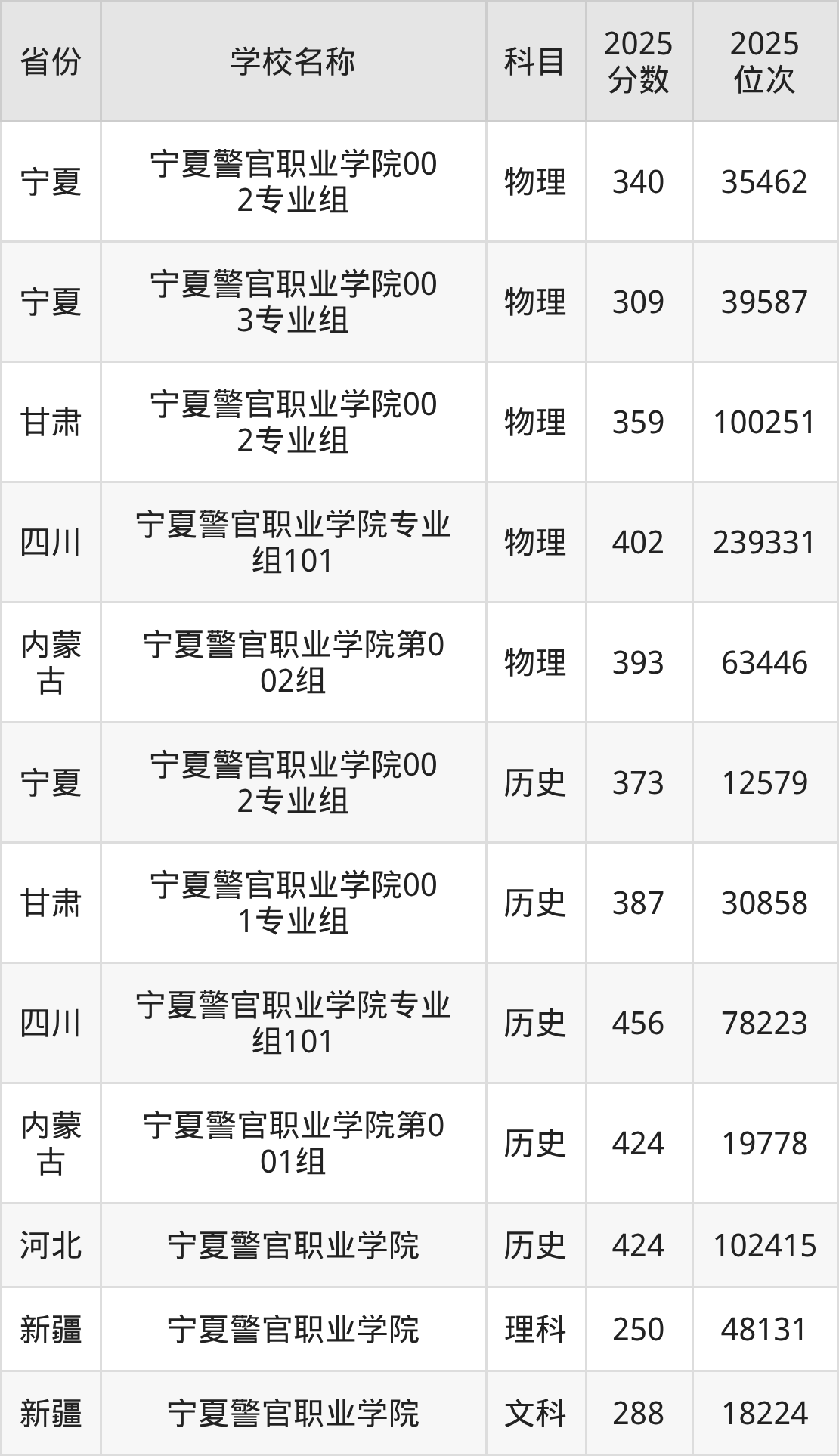 宁夏警官职业学院2025年有3个专业组面向宁夏回族自治区内首选了物理科目的考生招生: