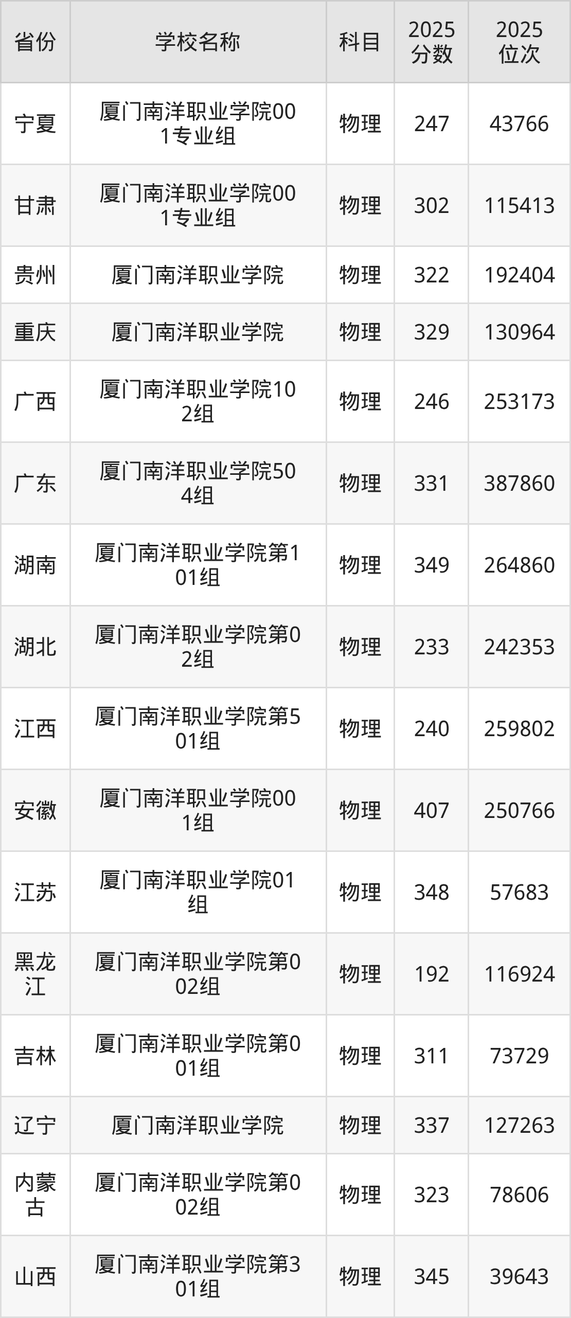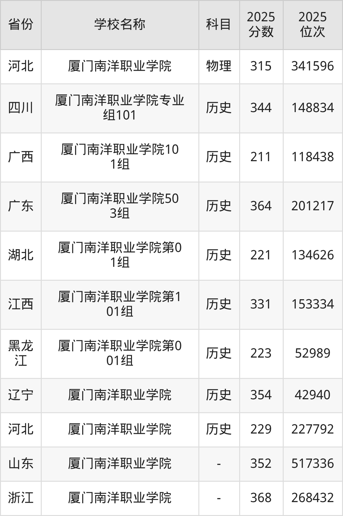 2025年厦门南洋职业学院在全国各省专科的最低录取分数线在192~407分之间。安徽物理类高考生最低407分能上厦门南洋职业学院、浙江高考生最低368分能上厦门南洋职业学院……下文将展示厦门南洋职业学院在全国20个高考省份中的专科最低投档录取分汇总!