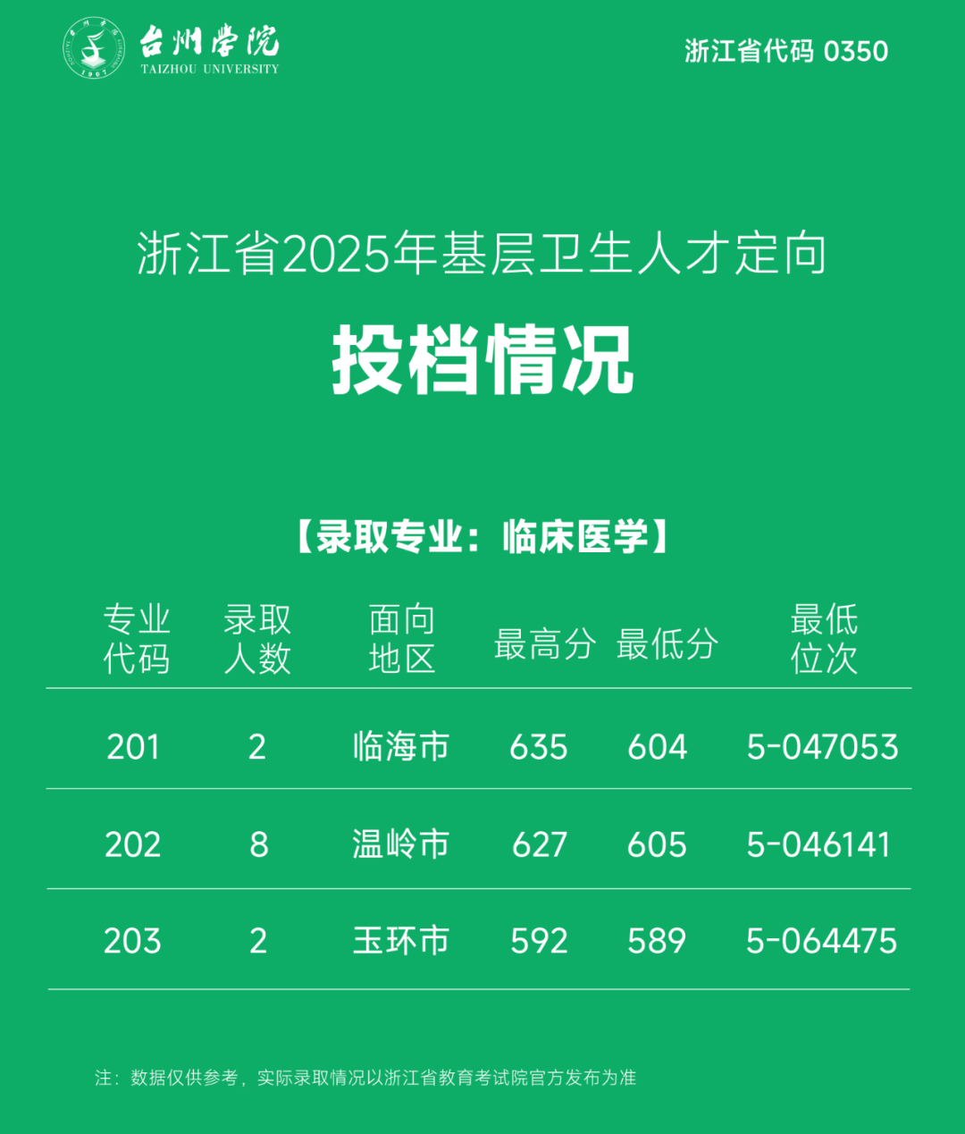 2025年基层卫生人才定向(临床医学专业)招生共录取18人,最低分559分、最高分627分。