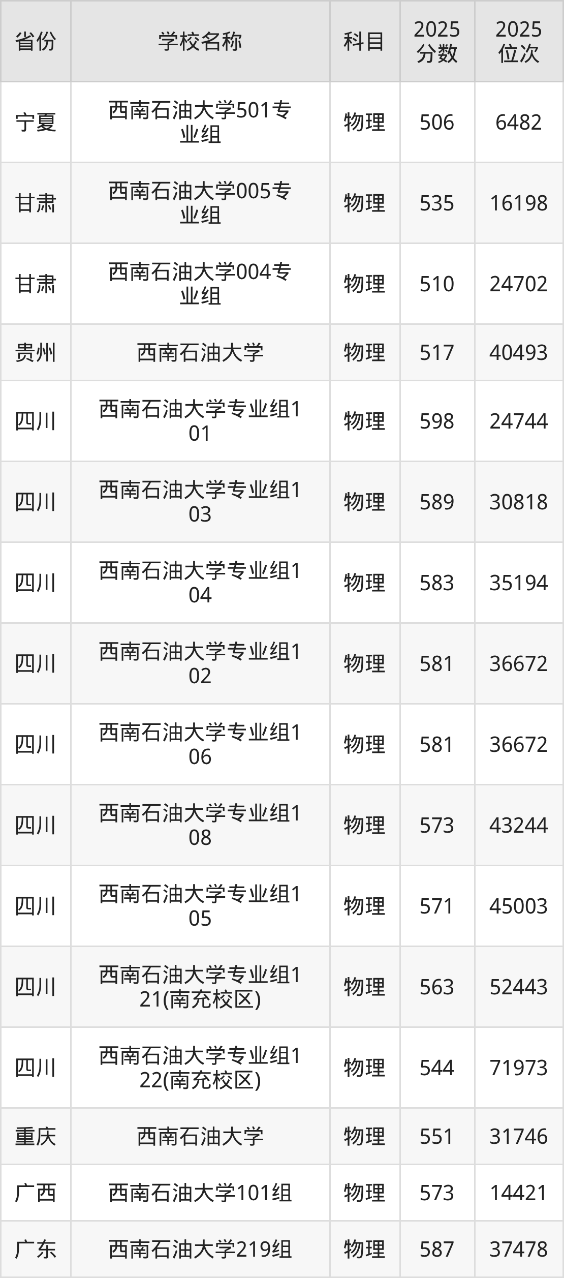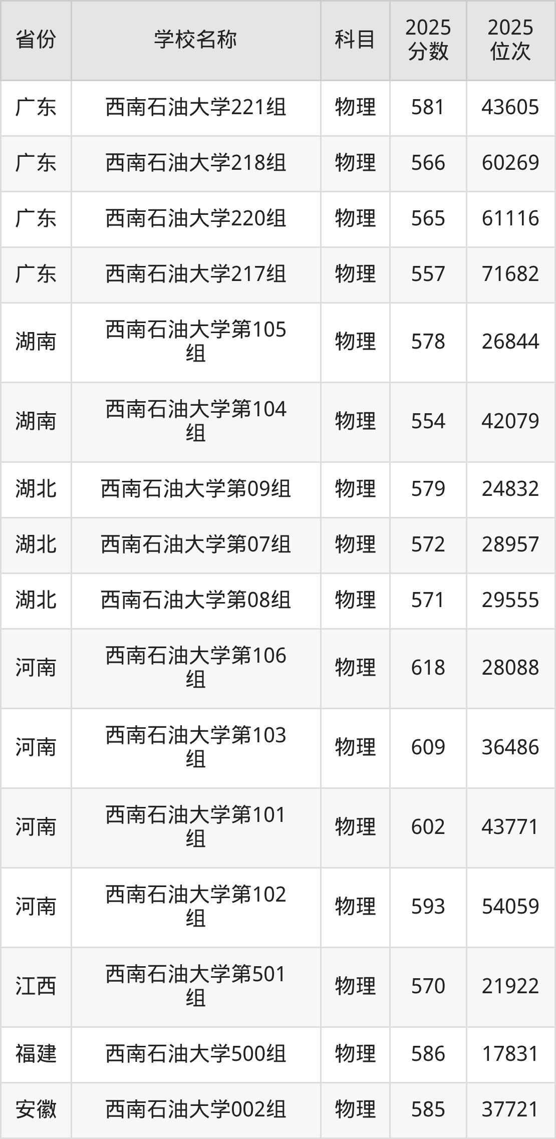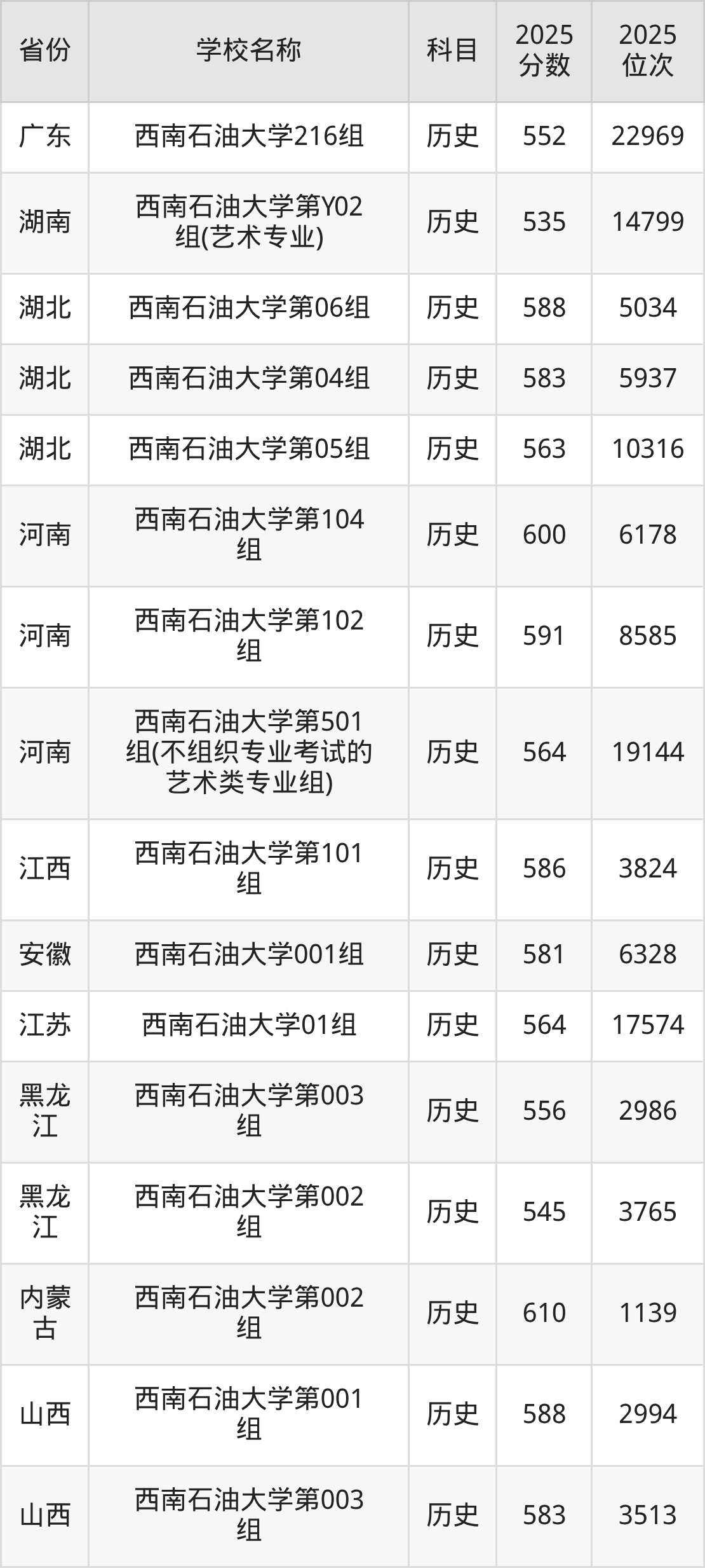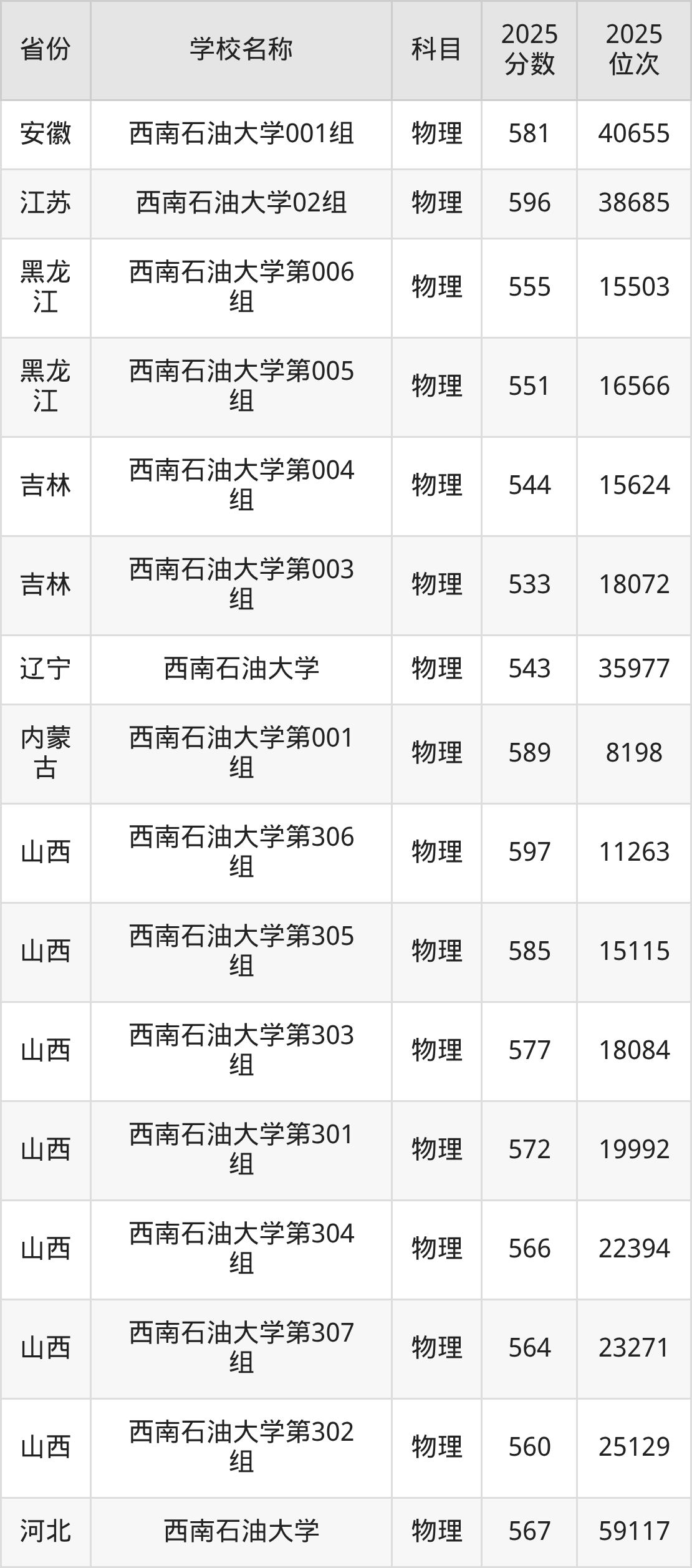 二、西南石油大学各专业录取分数线
