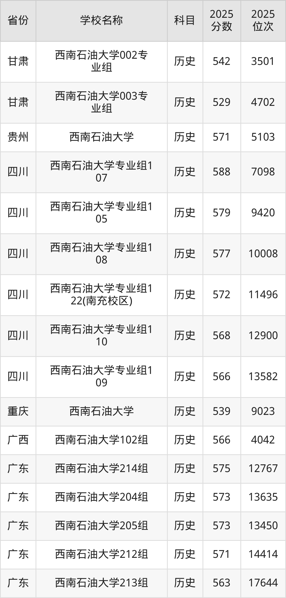 西南石油大学2025年有6个专业组面向四川省内首选了历史科目的考生招生: