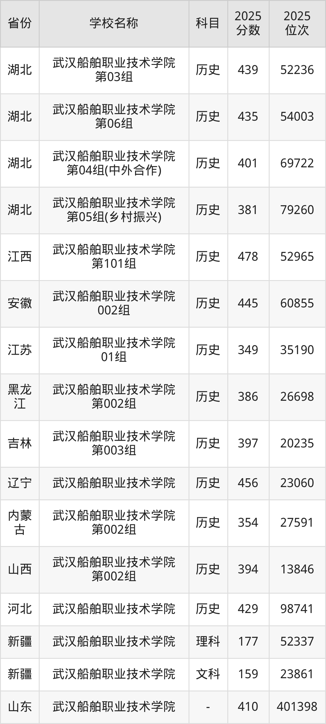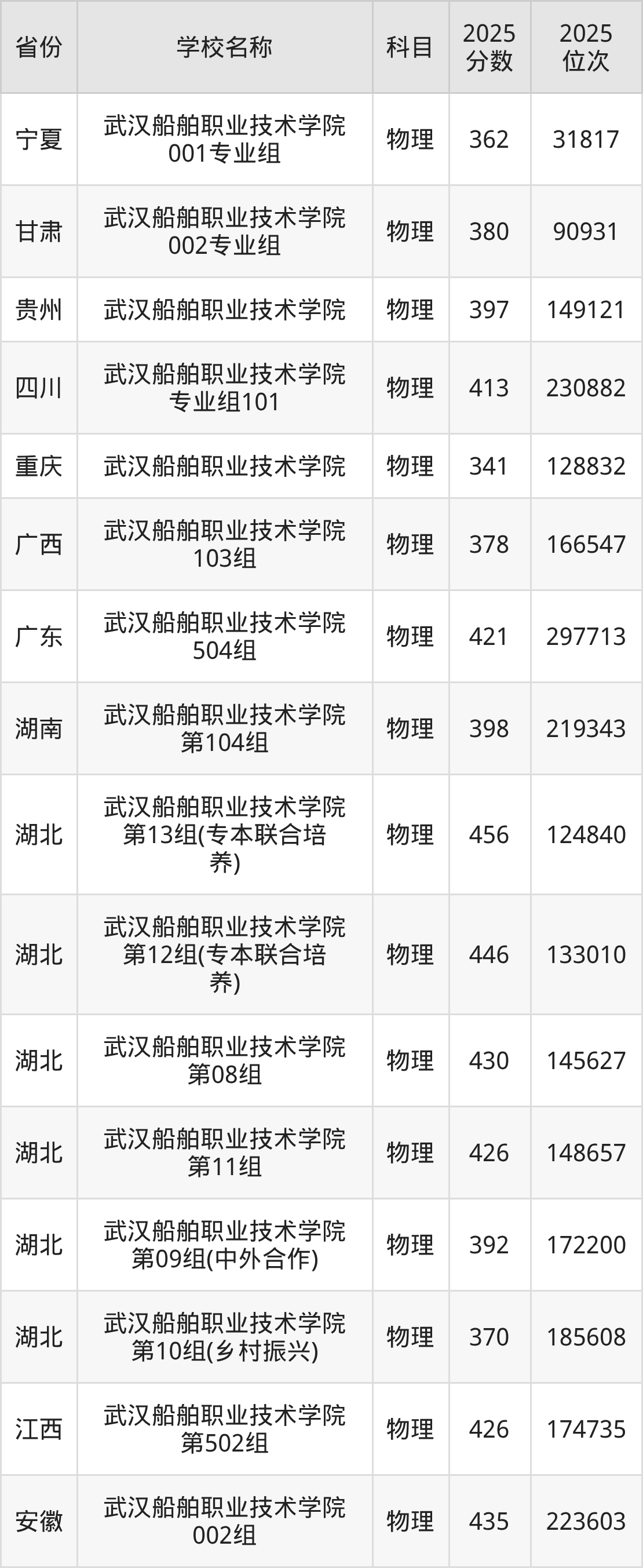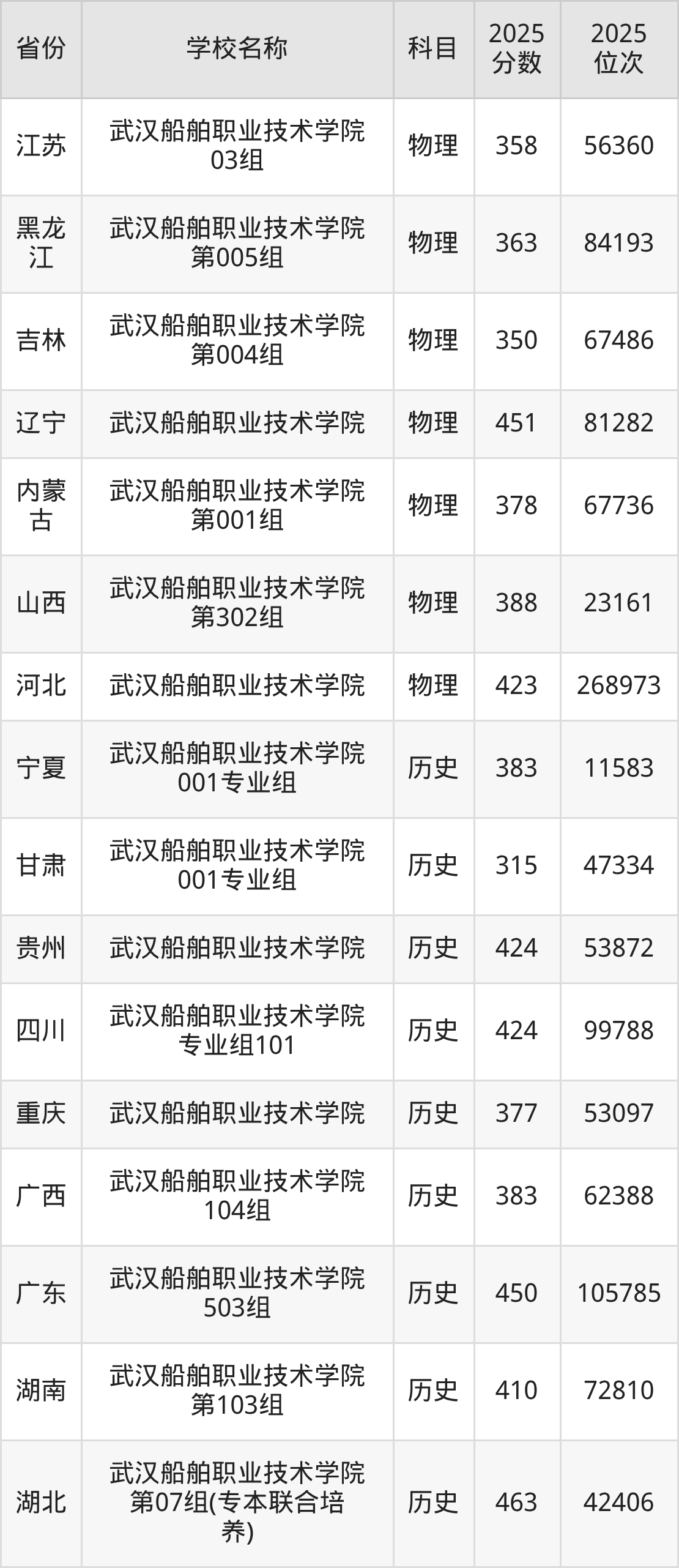二、武汉船舶职业技术学院各专业录取分数线
