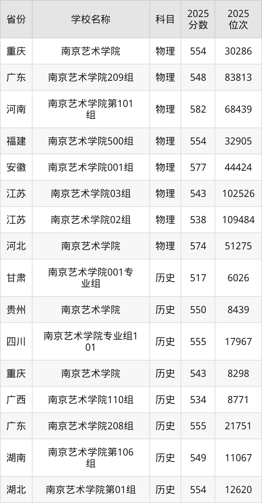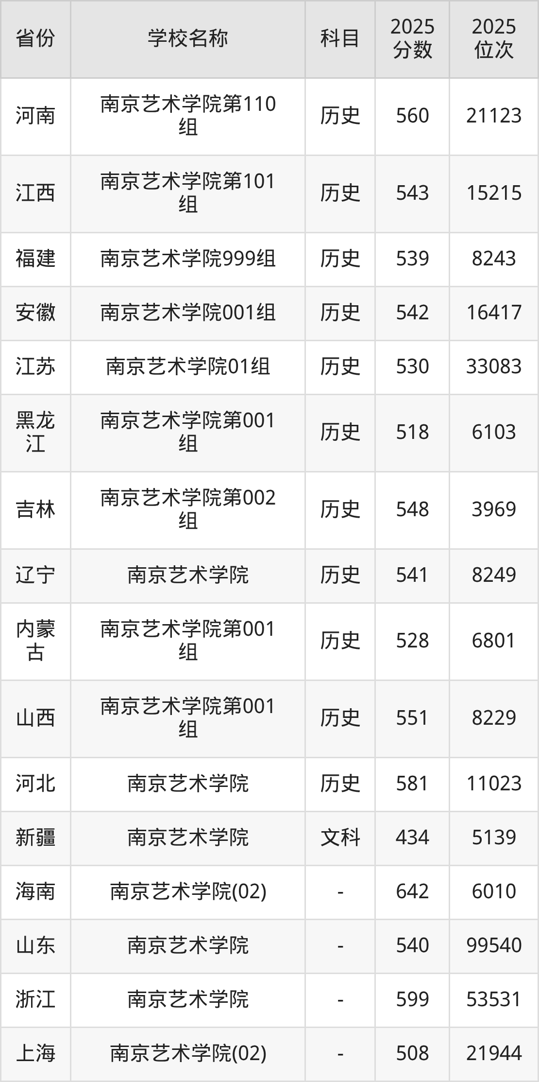 二、南京艺术学院各专业录取分数线