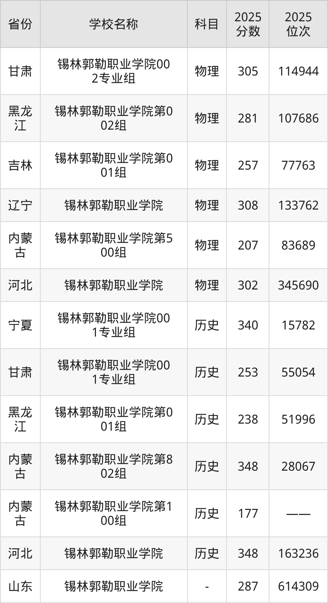 一、2025锡林郭勒职业学院录取分数线