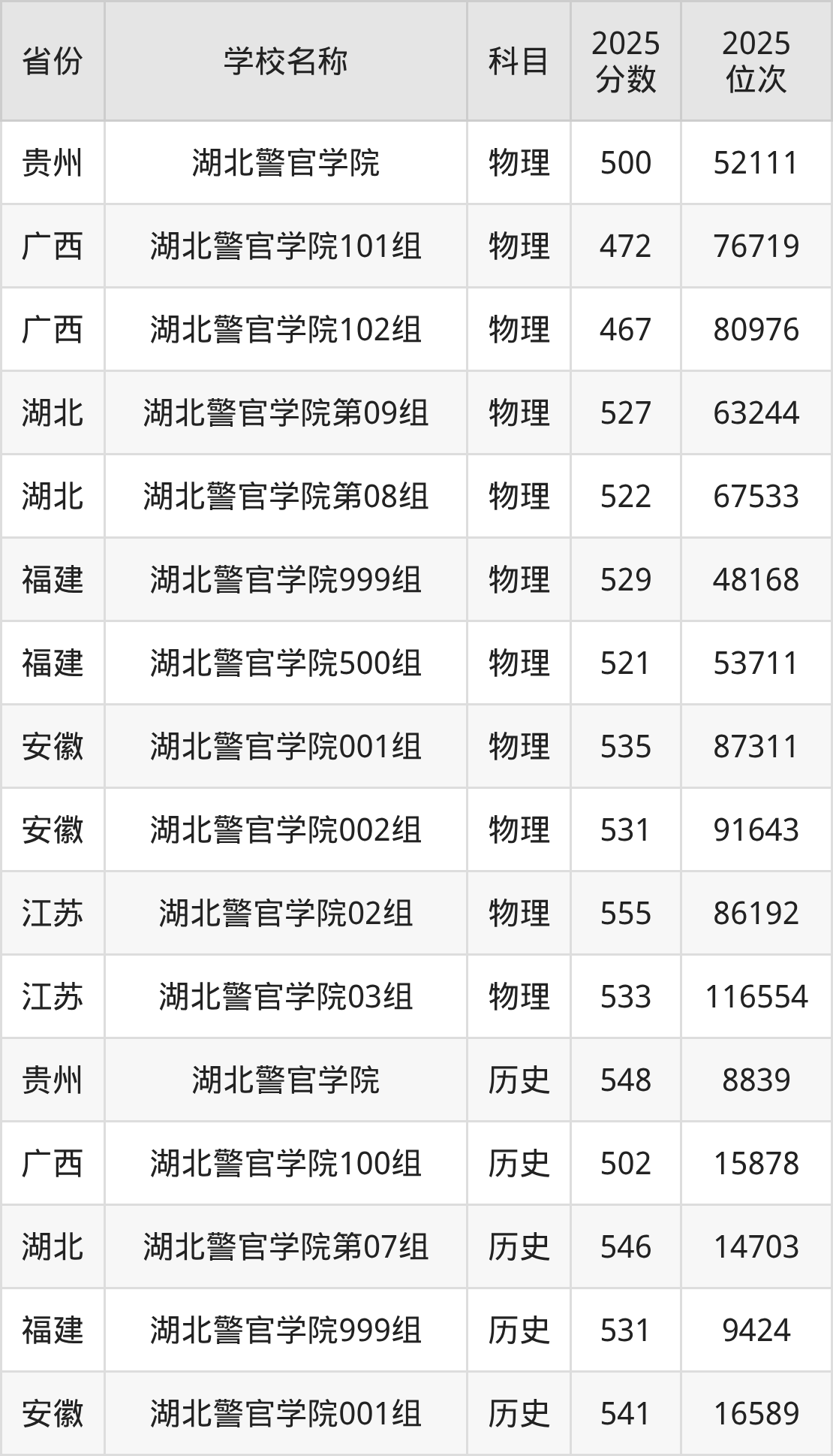 湖北警官学院2025年有2个专业组面向湖北省内首选了物理科目的考生招生: