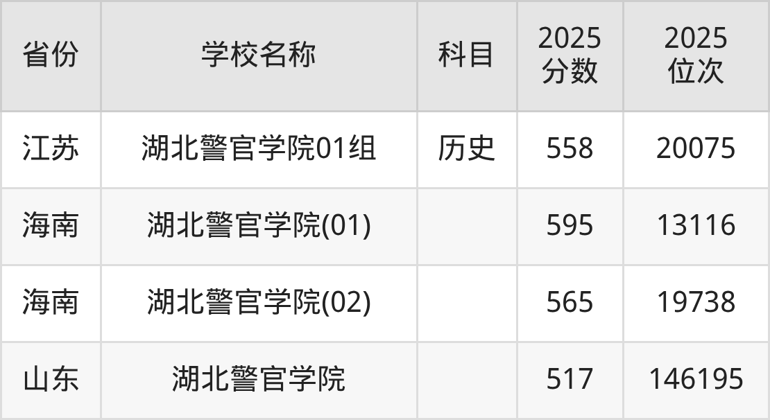 湖北警官学院2025年有1个专业组面向湖北省内首选了历史科目的考生招生: