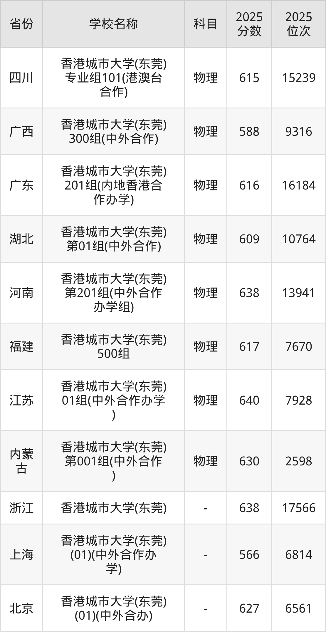 2025年香港城市大学(东莞)在全国各省本科的最低录取分数线在566~640分之间。江苏物理类高考生最低640分能上香港城市大学(东莞)、河南物理类高考生最低638分能上香港城市大学(东莞)……下文将展示香港城市大学(东莞)在全国11个高考省份中的本科最低投档录取分汇总!