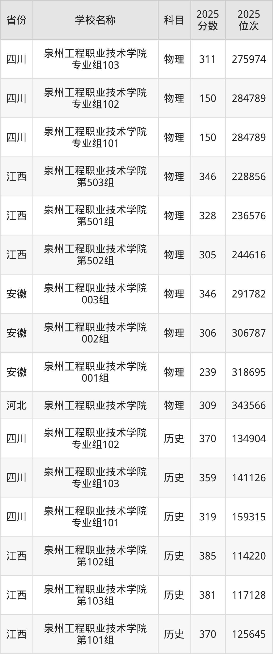 2025年泉州工程职业技术学院在全国各省专科的最低录取分数线在150~385分之间。江西物理类高考生最低346分能上泉州工程职业技术学院、安徽物理类高考生最低346分能上泉州工程职业技术学院……下文将展示泉州工程职业技术学院在全国4个高考省份中的专科最低投档录取分汇总!
