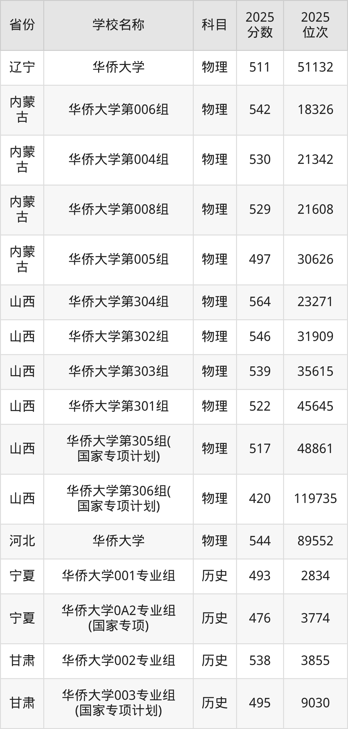 二、华侨大学各专业录取分数线