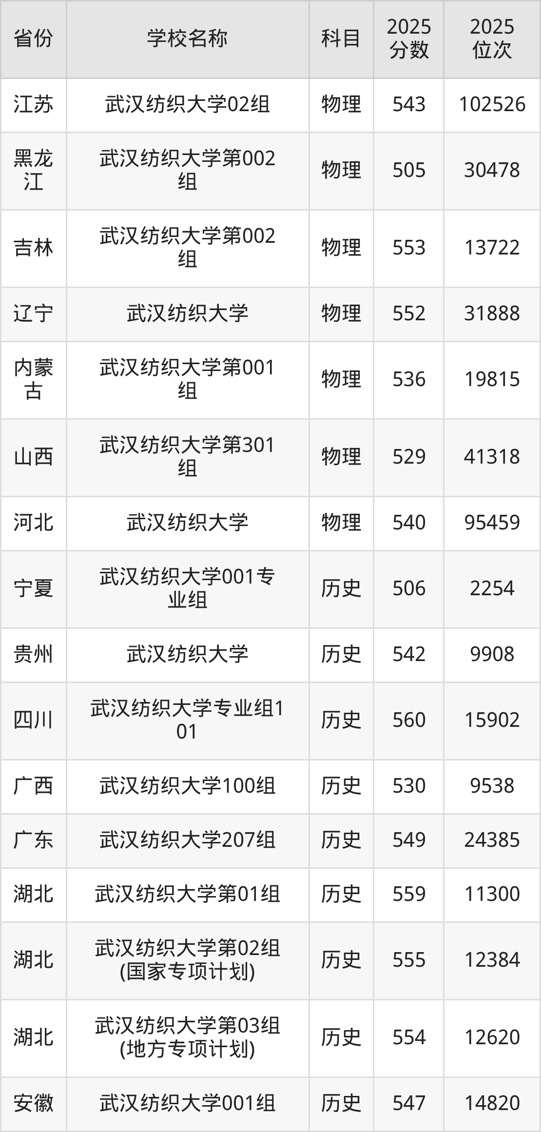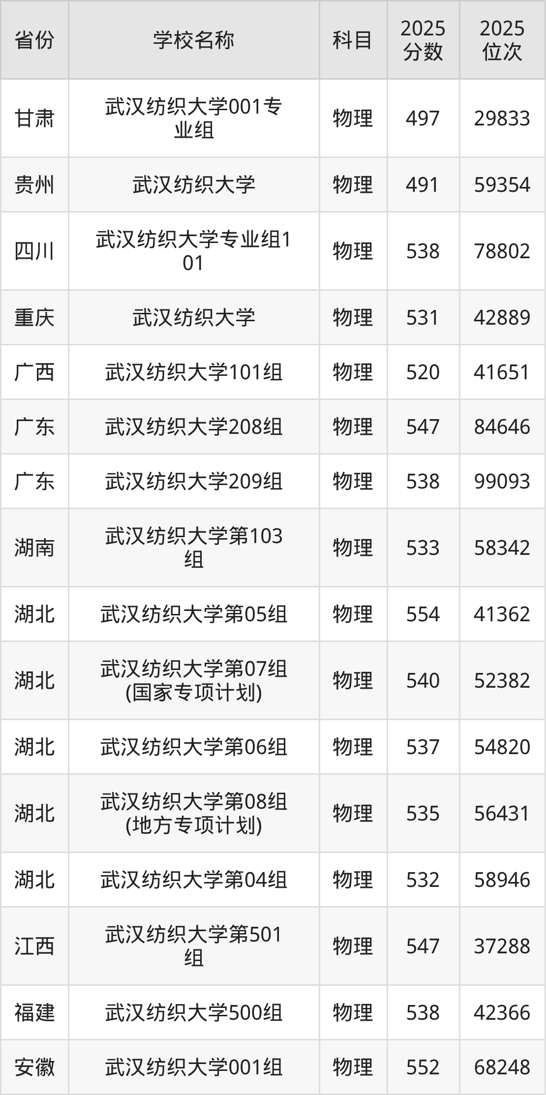 武汉纺织大学2025年有5个专业组面向湖北省内首选了物理科目的考生招生: