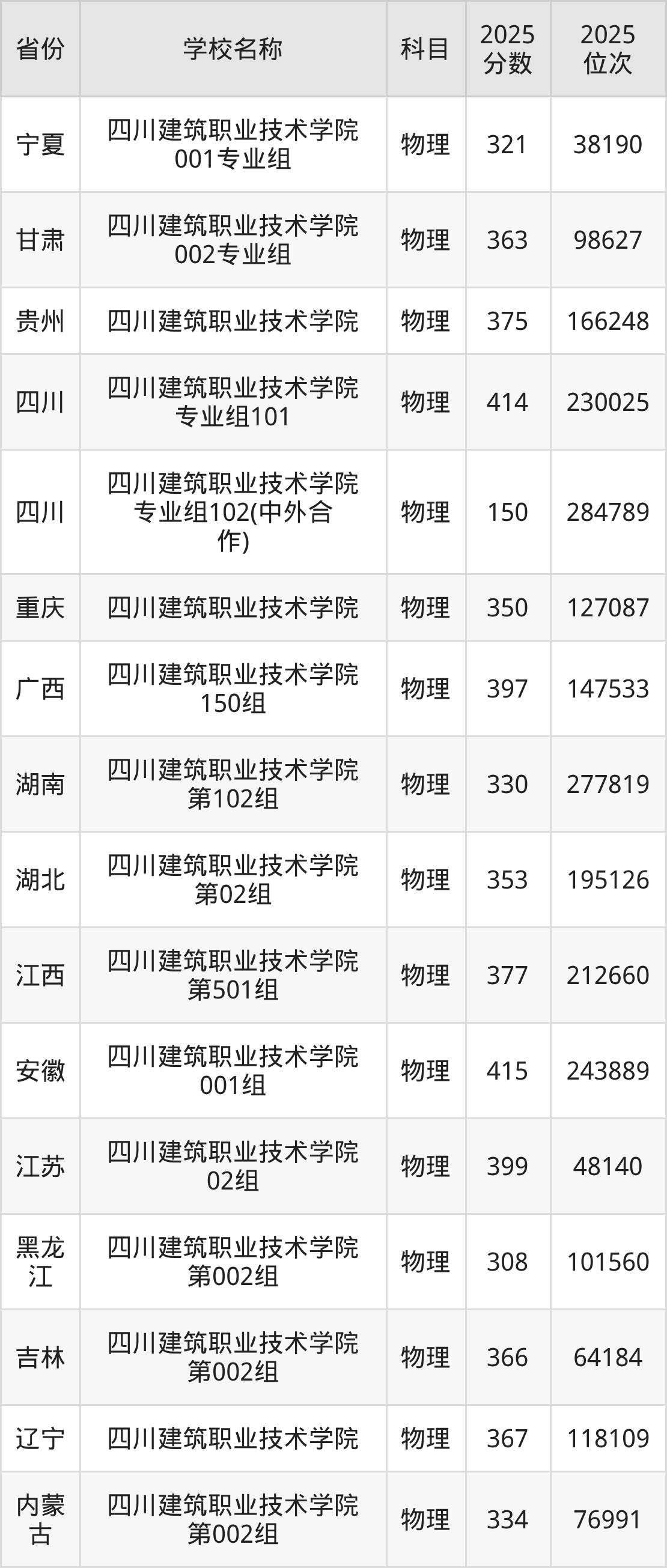 四川建筑职业技术学院2025年有2个专业组面向四川省内首选了物理科目的考生招生: