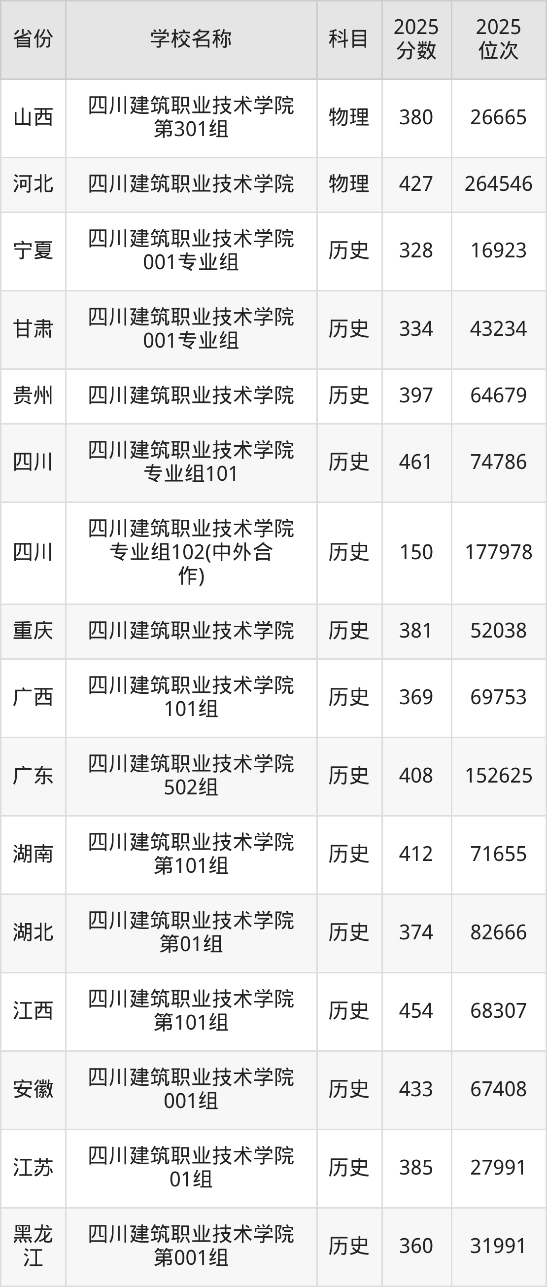 四川建筑职业技术学院2025年有2个专业组面向四川省内首选了历史科目的考生招生: