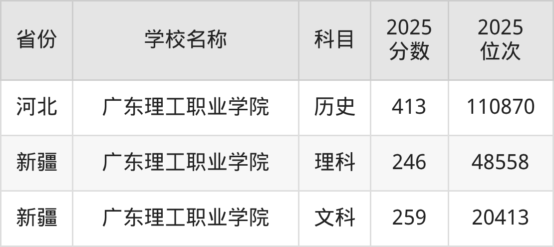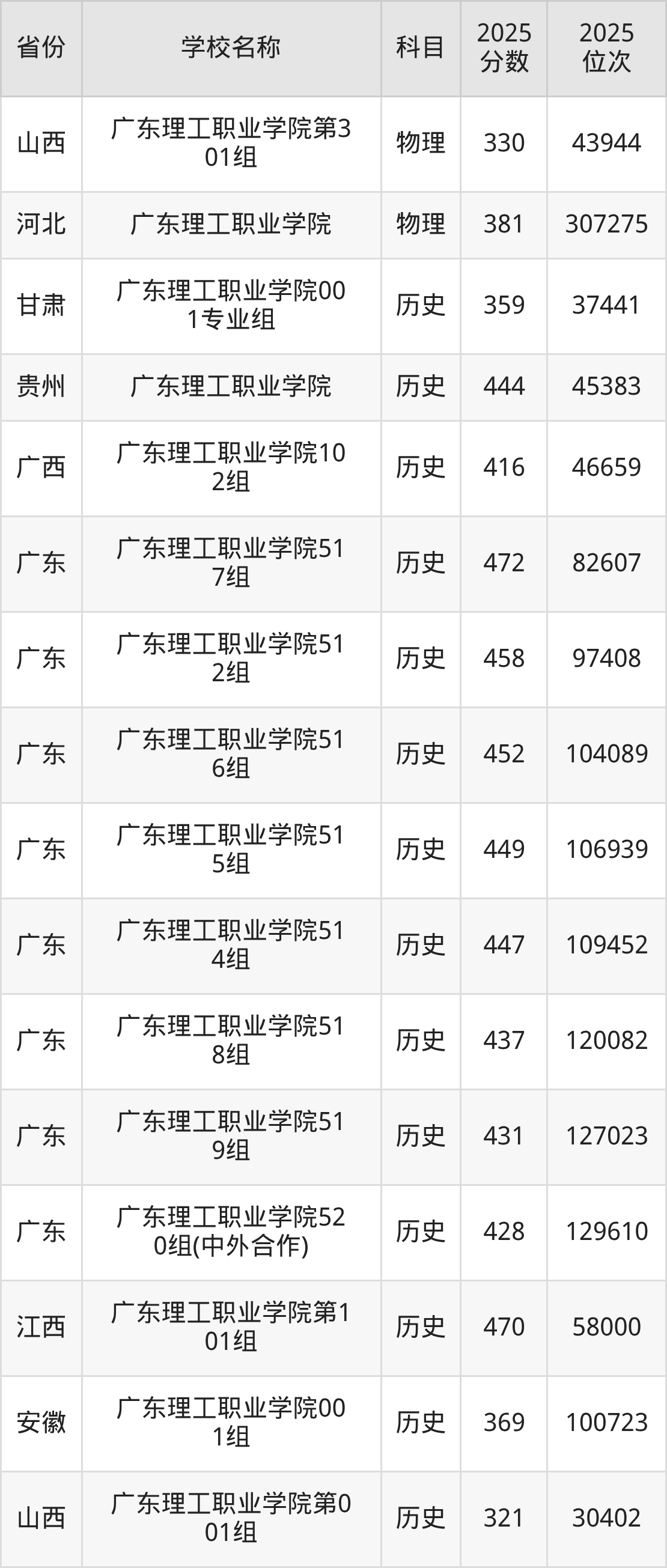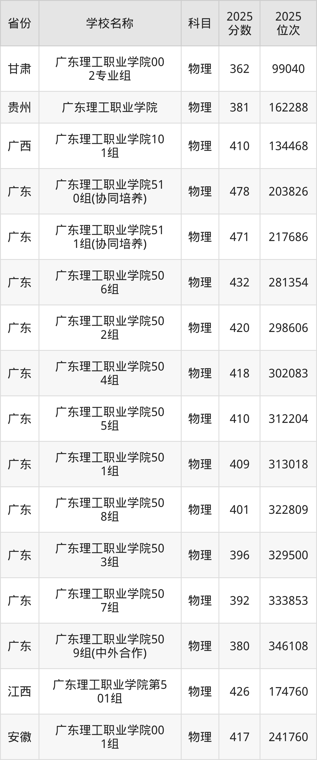 2025年广东理工职业学院在全国各省专科的最低录取分数线在246~478分之间。广东物理类高考生最低478分能上广东理工职业学院、江西物理类高考生最低426分能上广东理工职业学院……下文将展示广东理工职业学院在全国9个高考省份中的专科最低投档录取分汇总!