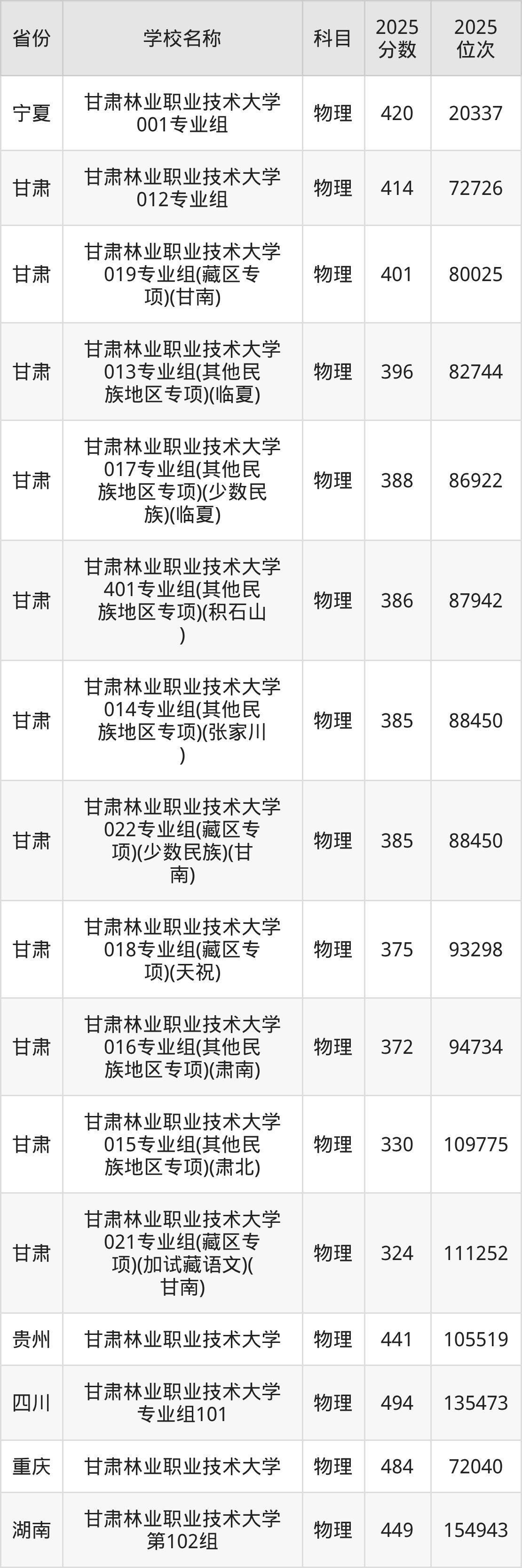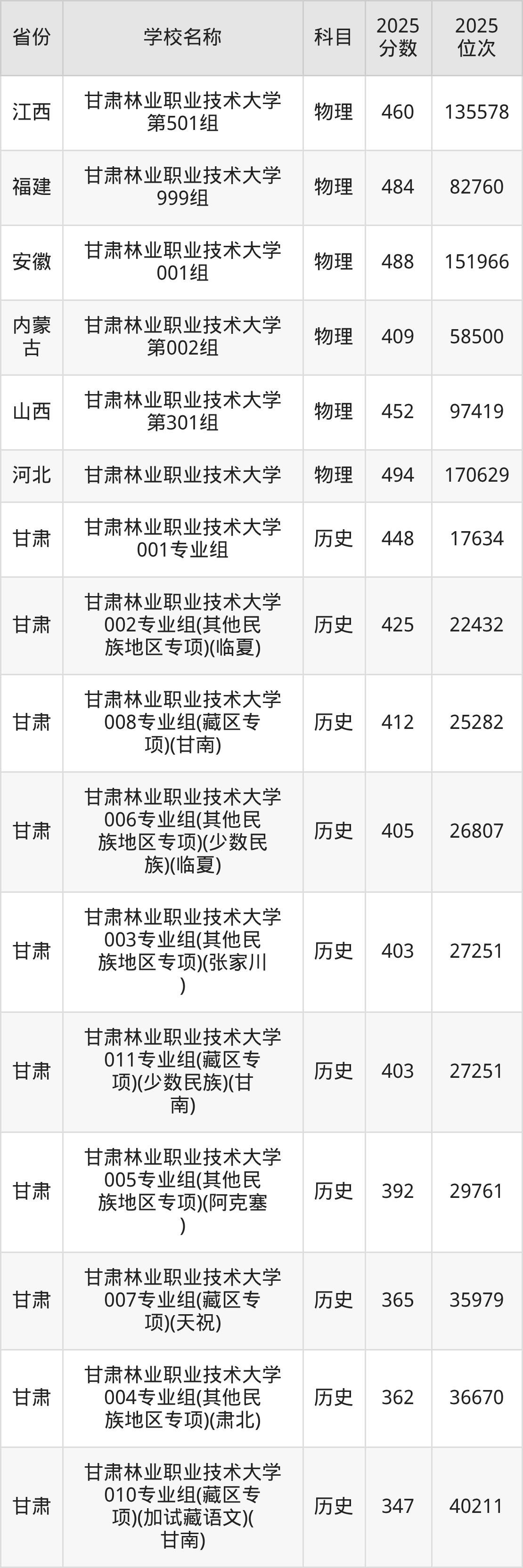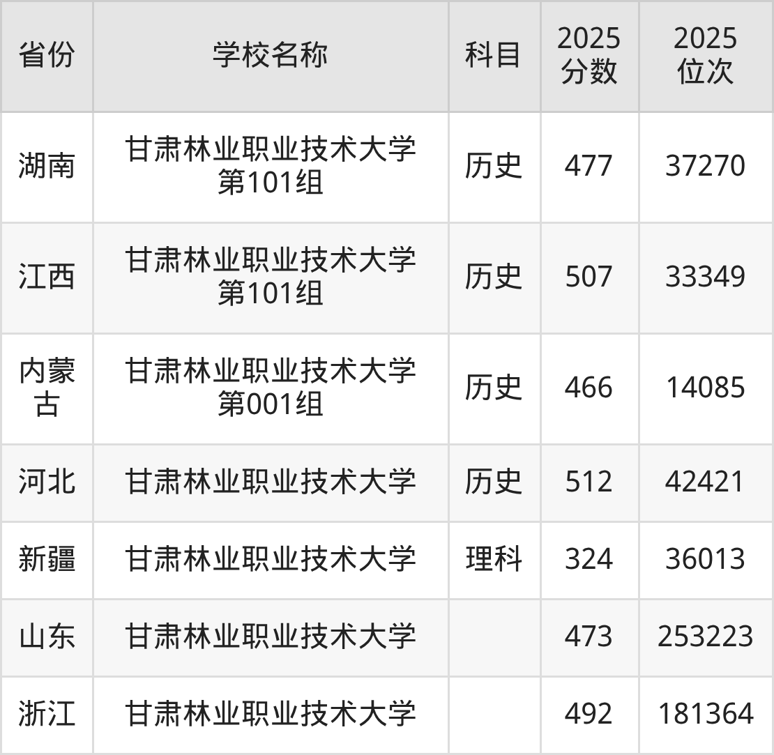 一、2025甘肃林业职业技术大学录取分数线