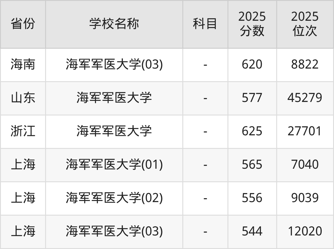 2025年海军军医大学在全国各省本科的最低录取分数线在544~625分之间。浙江高考生最低625分能上海军军医大学、海南高考生最低620分能上海军军医大学……下文将展示海军军医大学在全国12个高考省份中的本科最低投档录取分汇总!