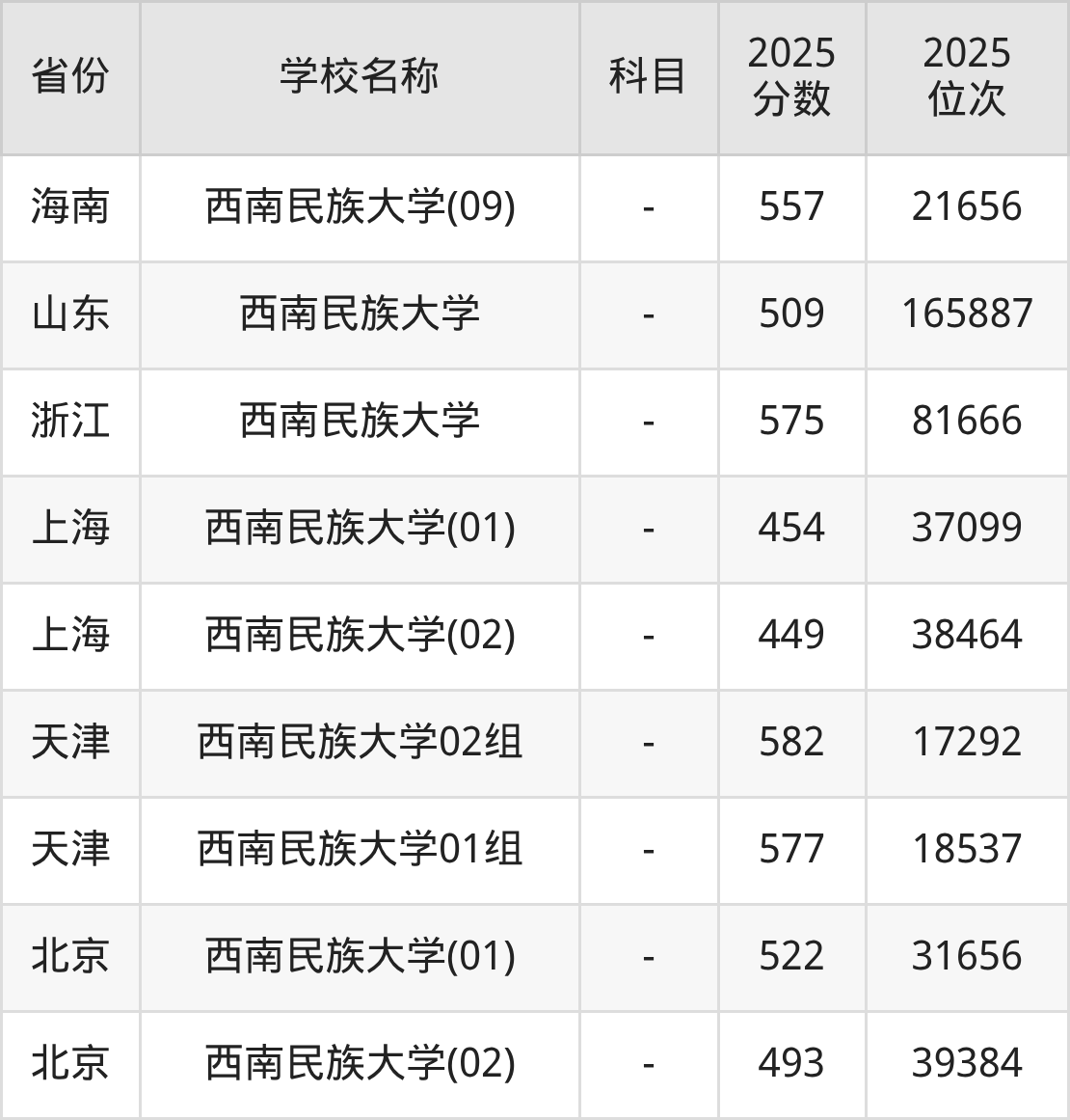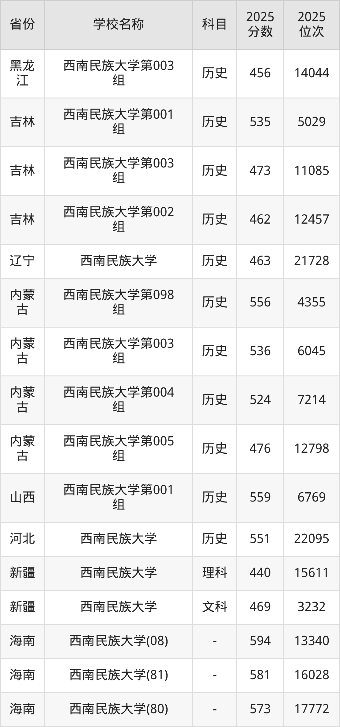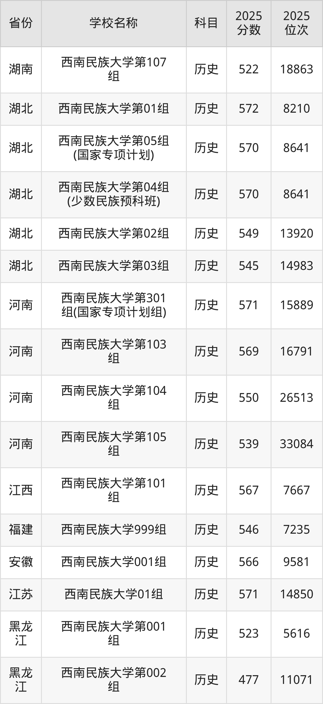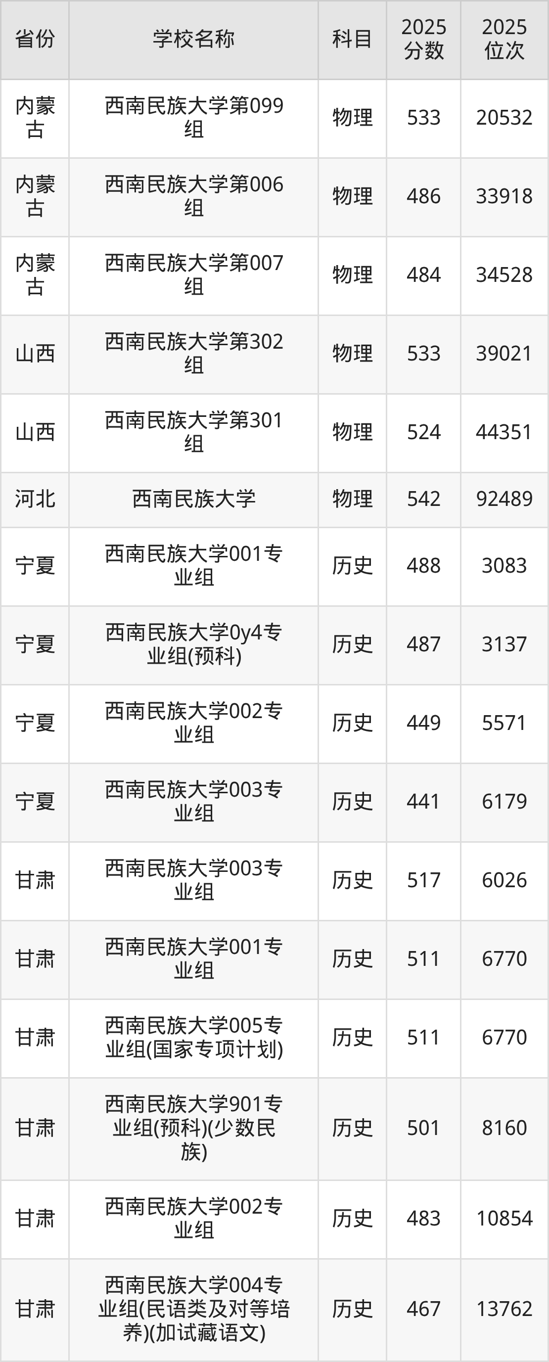 二、西南民族大学各专业录取分数线