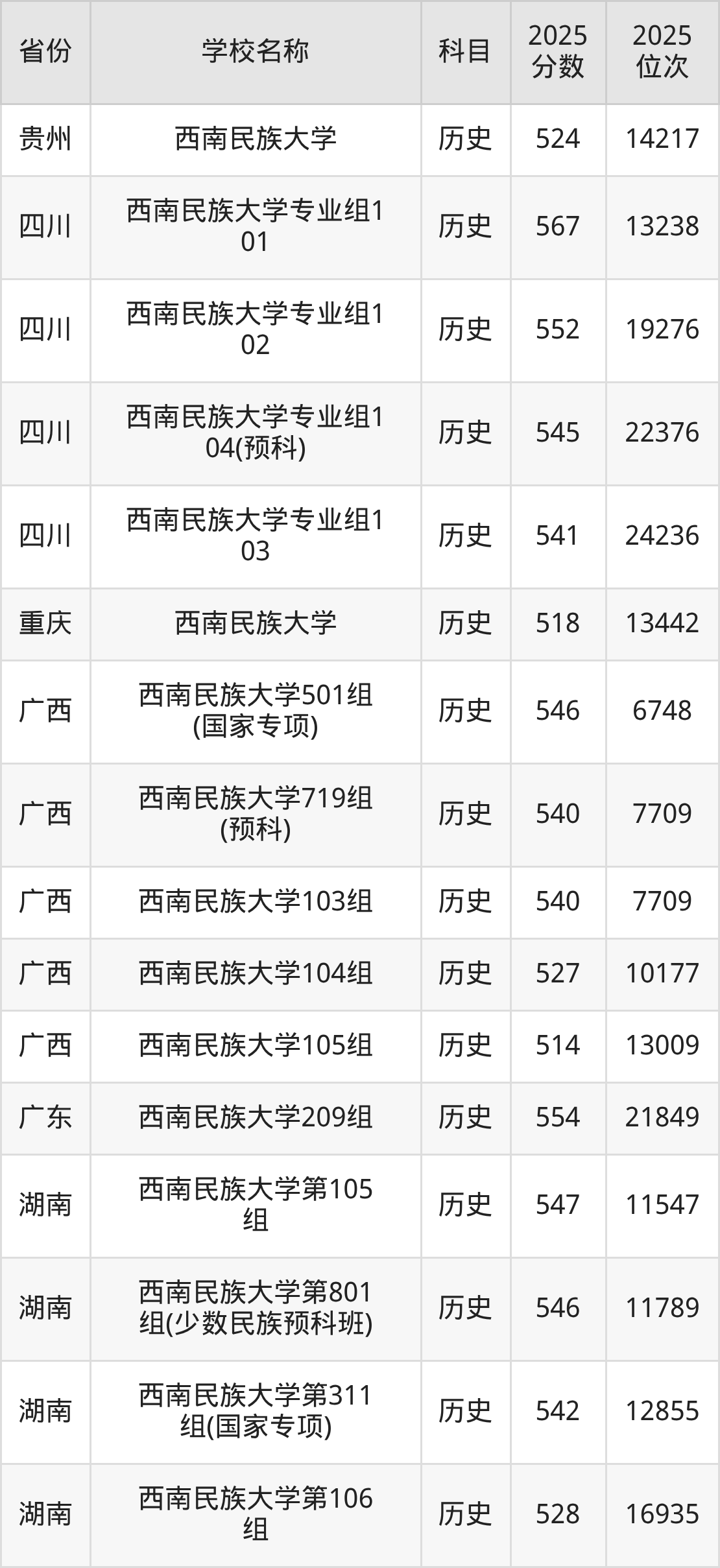 西南民族大学2025年有4个专业组面向四川省内首选了历史科目的考生招生: