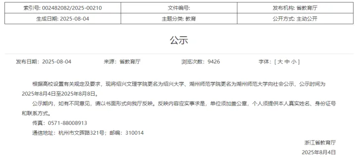2025年,十四五收官之年,高校更名浪潮持续涌动!浙江、福建、内蒙古、陕西四省区教育厅最新公示:绍兴文理学院、湖州师范学院、闽江学院、赤峰学院、榆林学院这5所高校,正式申请更名为“大学”。对于2026届高考生及家长而言,这不仅是名称的变更,更意味着学校综合实力提升、社会认可度提高以及未来报考的新选择。