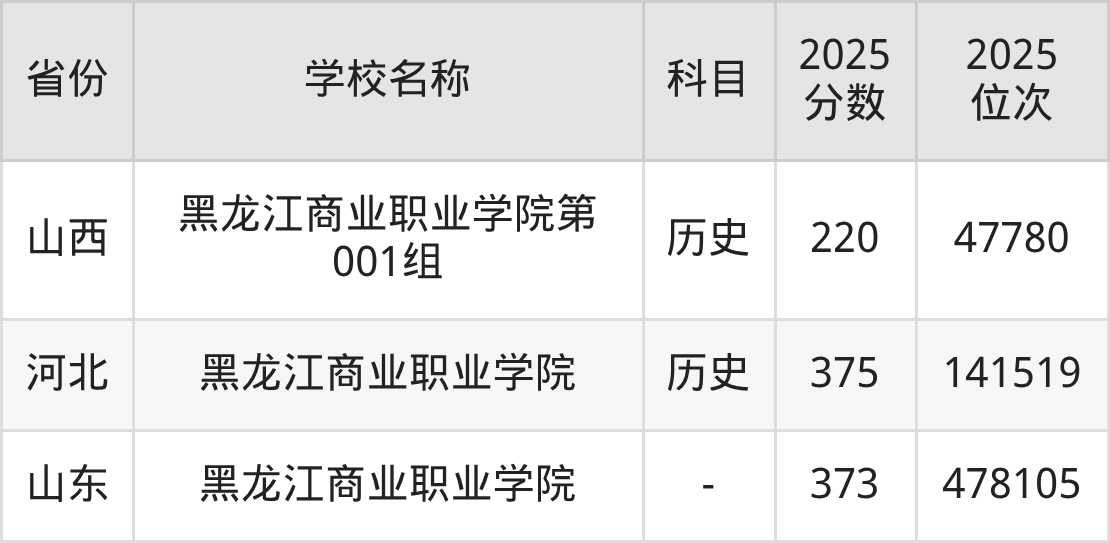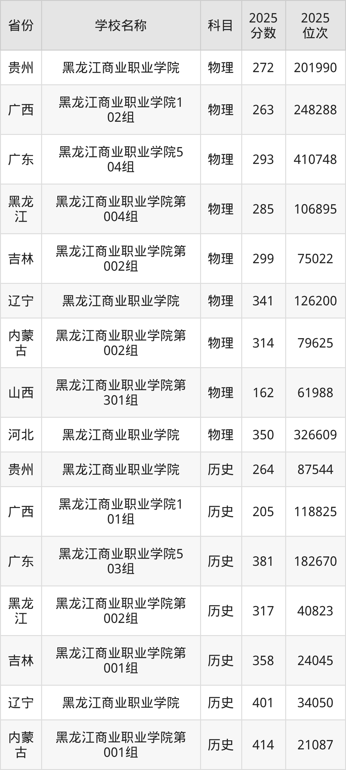 2025年黑龙江商业职业学院在全国各省专科的最低录取分数线在162~414分之间。山东高考生最低373分能上黑龙江商业职业学院、河北物理类高考生最低350分能上黑龙江商业职业学院……下文将展示黑龙江商业职业学院在全国10个高考省份中的专科最低投档录取分汇总!