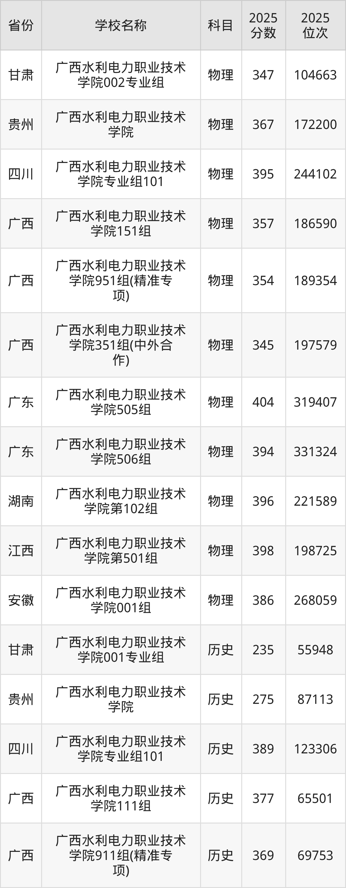 2025年广西水利电力职业技术学院在全国各省专科的最低录取分数线在235~410分之间。广东物理类高考生最低404分能上广西水利电力职业技术学院、江西物理类高考生最低398分能上广西水利电力职业技术学院……下文将展示广西水利电力职业技术学院在全国9个高考省份中的专科最低投档录取分汇总!