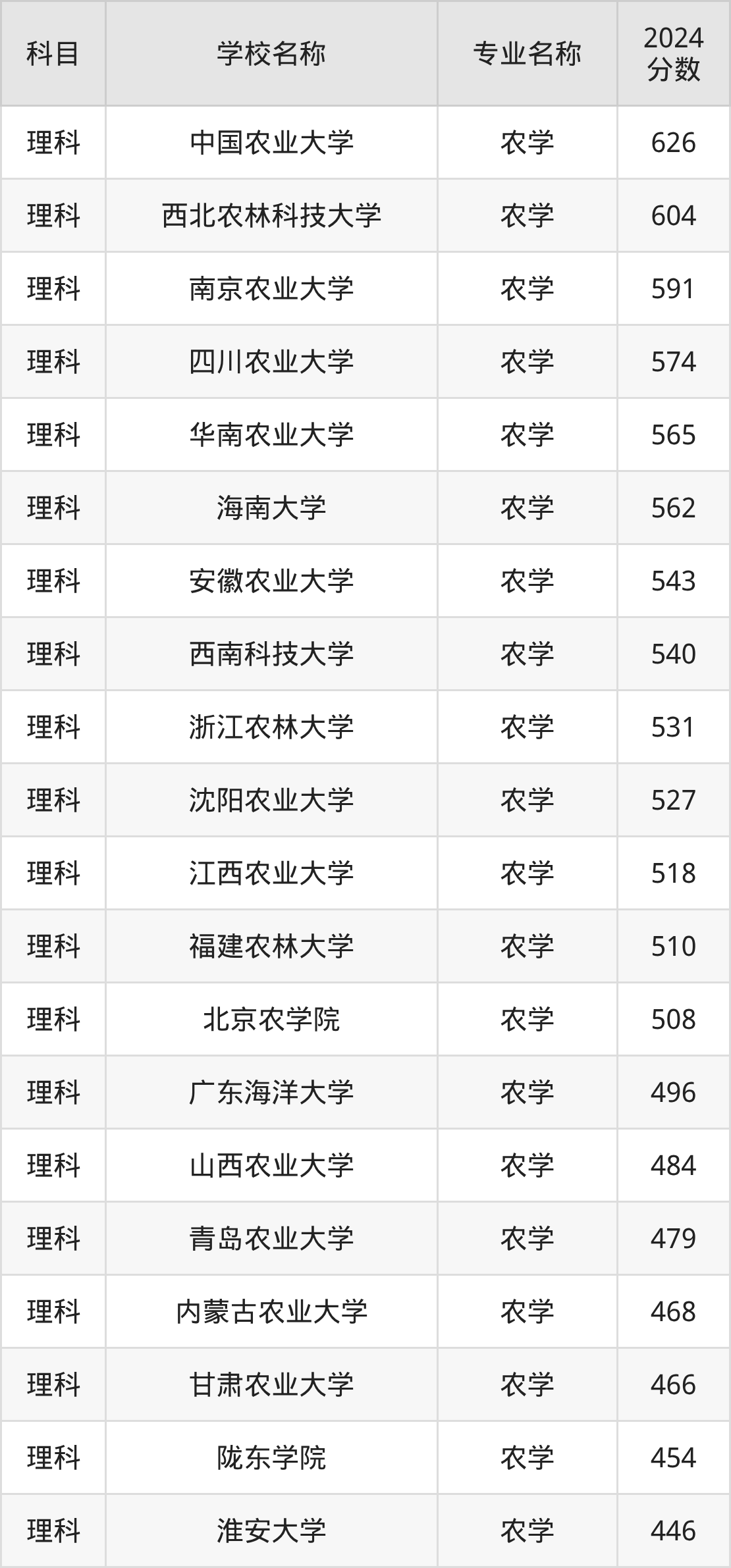通过上文大家可以知晓,在云南省内招农学专业的院校数量较少,所以下文将为2026届高考生继续展示:省外大学的农学专业2024年在云南高考的录取情况,包含中国农业大学、西北农林科技大学、南京农业大学、四川农业大学、华南农业大学。